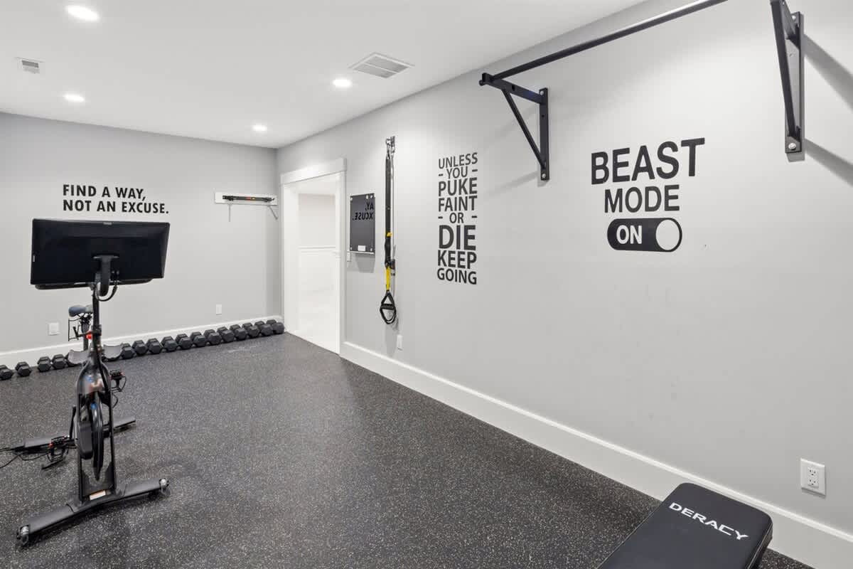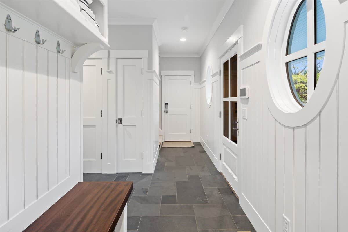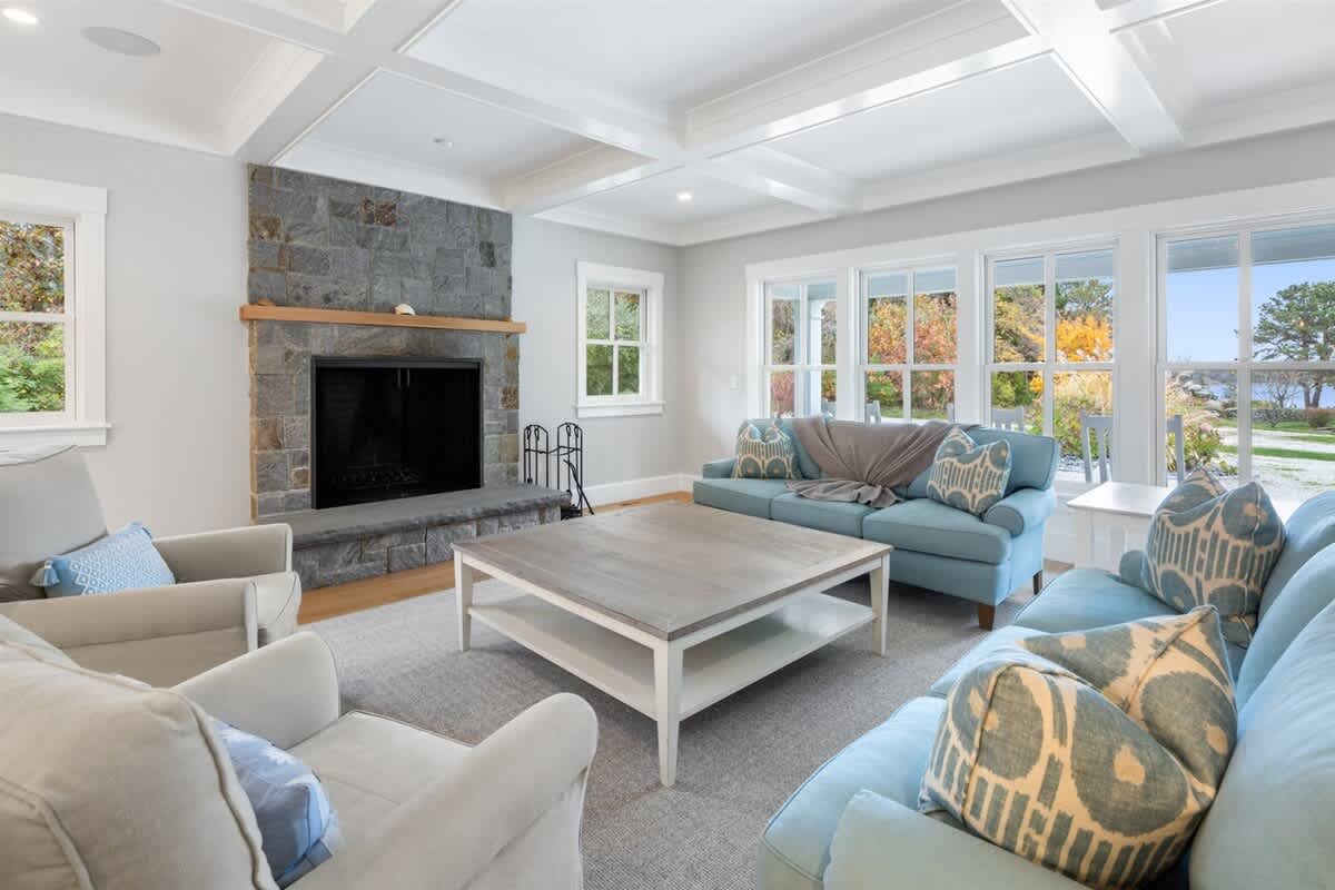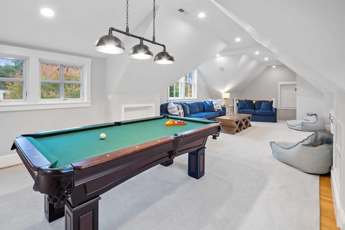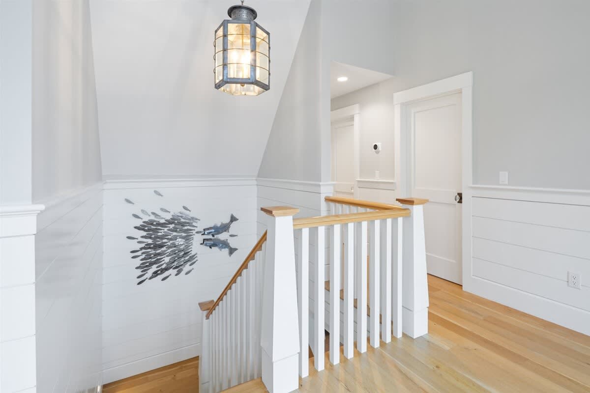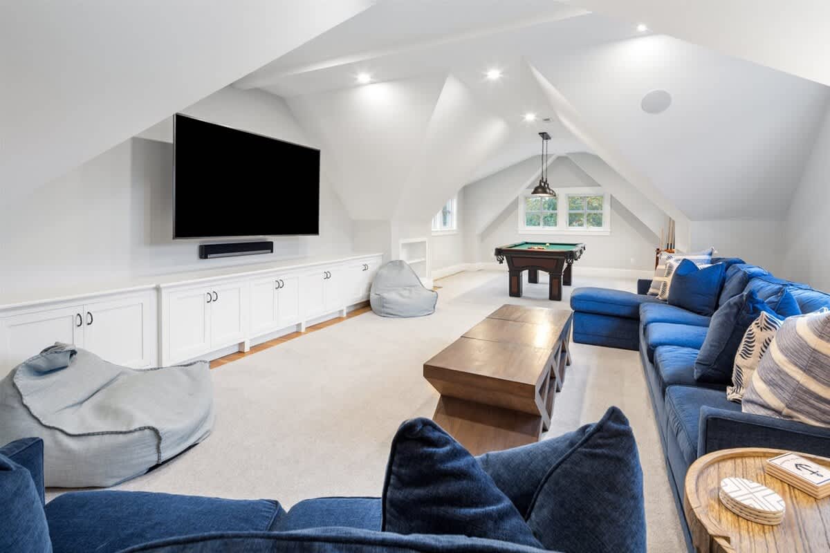 As you reach the end of the drive and the estate reveals itself, it's impossible not to be charmed. A delightful front porch awaits, with rocking chairs perfect for lazy days spent watching the sun dance on the bay. The facade has bright shudders adorned with starfish cutouts, adding a lovely coastal flare. Entering through the front door, you'll discover a striking and well appointed living, dining, and kitchen space. The room is bursting with oppulence, with tastfully selected furniture, coffered ceilings, and a top of the line kitchen. This room connects to a covered screened-in porch that overlooks the backyard, offering a second dining table and plenty of seating. The porch opens to the true star of this property, the gorgeous heated saltwater swimming pool. Here you can bask in the sun, take a refreshing dip, then rinse off in the outdoor shower. There's a gas grill, outdoor dining table, and a beautiful stone fire pit surrounded by Adirondak chairs. In the evenings, retire to the upstairs recreation room, where you'll find a pool table, enormous wall mounted Smart TV, and a cozy sectional sofa.Â