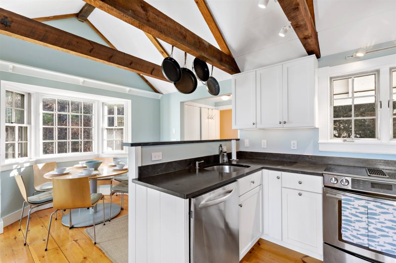 The house has two spacious decks, perfect for outdoor gatherings. Step inside to an eat-in kitchen, complete with a cozy breakfast nook framed by a bright bay window. The kitchen is well appointed with up to date appliances. Vaulted ceilings with wood beams give the room an airy, open feel. The kitchen connects to the backyard deck, perfect for grilling and outdoor dining.