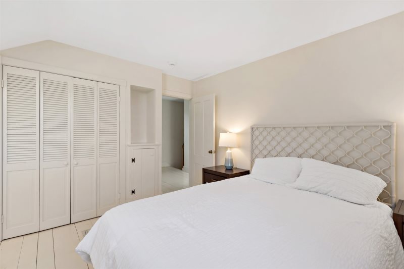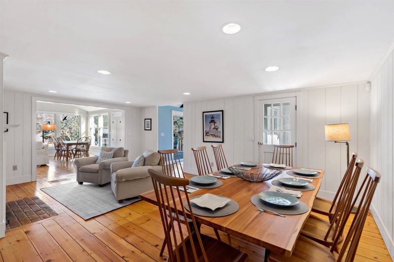 Pine floors continue throughout the first floor. The open layout of dining and living spaces with walls of windows offers a dining table for eight, ample comfortable seating, a smart TV, and additional dining space for six. Vaulted ceilings and a stunning inlaid stained glass window add architectural interest, while the bright white, airy Cape Cod design softened with warm wood tones makes every room feel sunny and cheerful. Off the main living area, a quiet den provides the perfect spot to curl up with a book to unwind, and offers the added convenience of a pullout couch for extra sleeping accommodations. All three bedrooms are cozy and well-appointed, including a convenient first-floor primary suite with a connected ensuite bathroom.