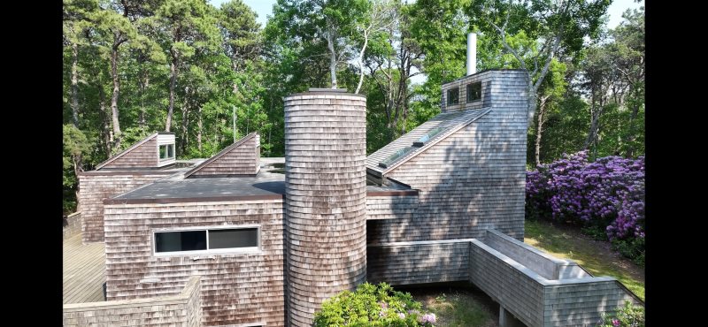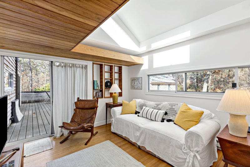 Welcome to Swaying Pines, a serene architectural retreat tucked away on an expansive wooded lot at the end of a magical private dirt road in East Orleans. Designed by a graduate of the Harvard Graduate School of Design in the mid-1960s, this original modern home is a striking example of thoughtful, era-defining architecture. The main house was built in the late 1960s, with a complementary guest house added in the 1980s, and together they create a harmonious compound connected by adjoining decks and a network of outdoor living spaces. The design intentionally optimizes natural light, cross-ventilation, and a seamless indoor/outdoor flow, allowing the home to feel fully immersed in its woodland surroundings.