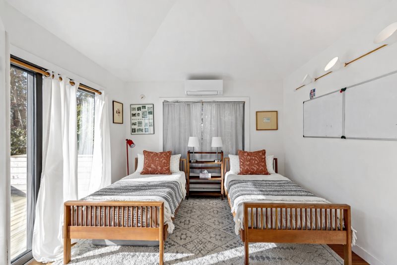 Arriving at the property, the home appears to rise organically into the tree canopy, blending effortlessly with the landscape. Inside, sliding glass doors flood the living spaces with natural light and open onto sun-drenched decks, while vaulted ceilings enhance the airy, open feel. The home’s modern design is complemented by multi-colored lighting and a charming collection of vintage board games from the 1970s and 1980s, adding personality and a nostalgic touch. The well-equipped kitchen flows into multiple dining areas, offering several options for indoor and outdoor meals — perfect for casual breakfasts, family dinners, or al fresco evenings under the trees. Sleeping accommodations are thoughtfully spread across the main house and guest house, featuring king, queen, and twin options, along with 3.5 baths. The guest house also includes a walk-in closet, providing added comfort and convenience for longer stays or extended families.