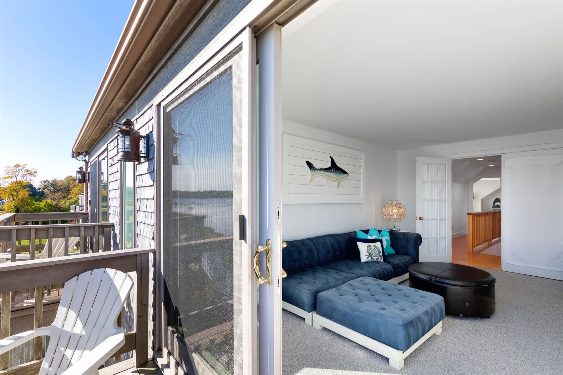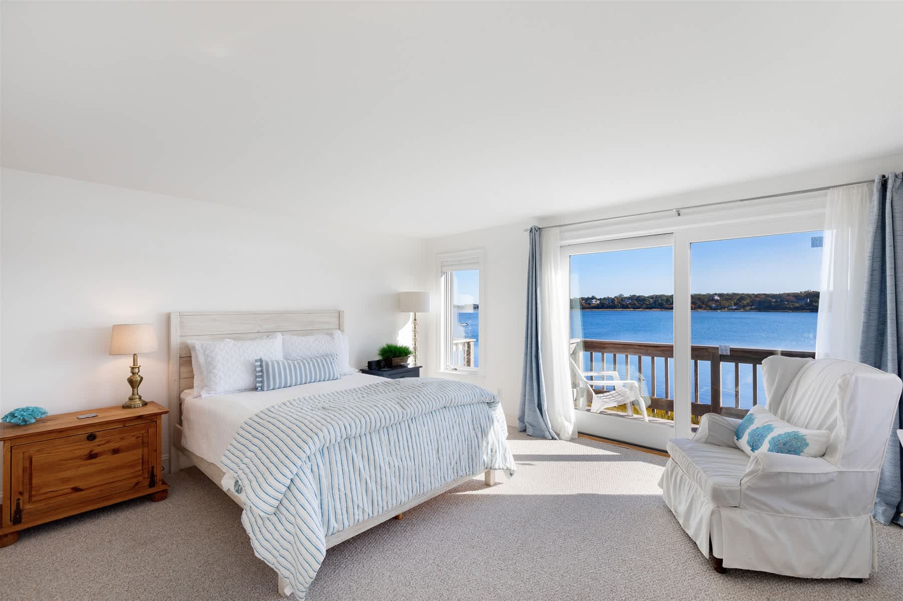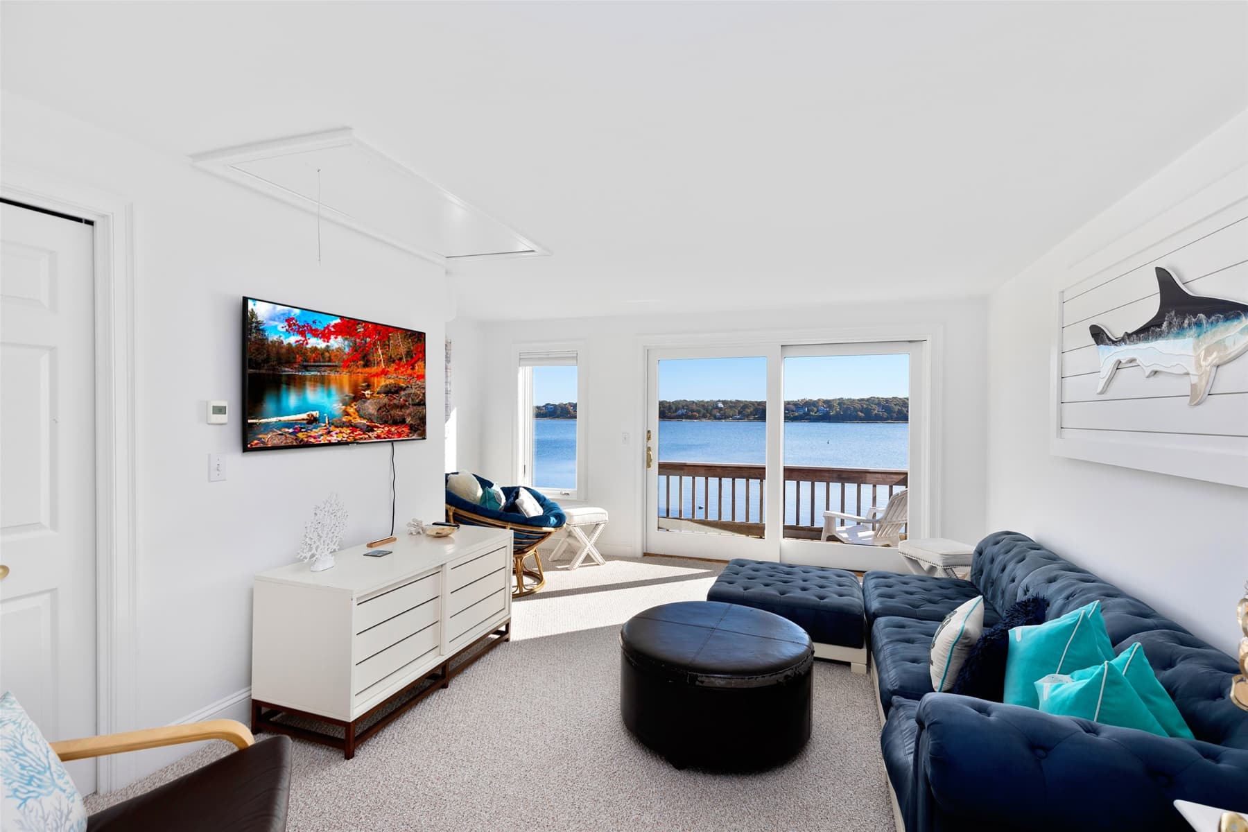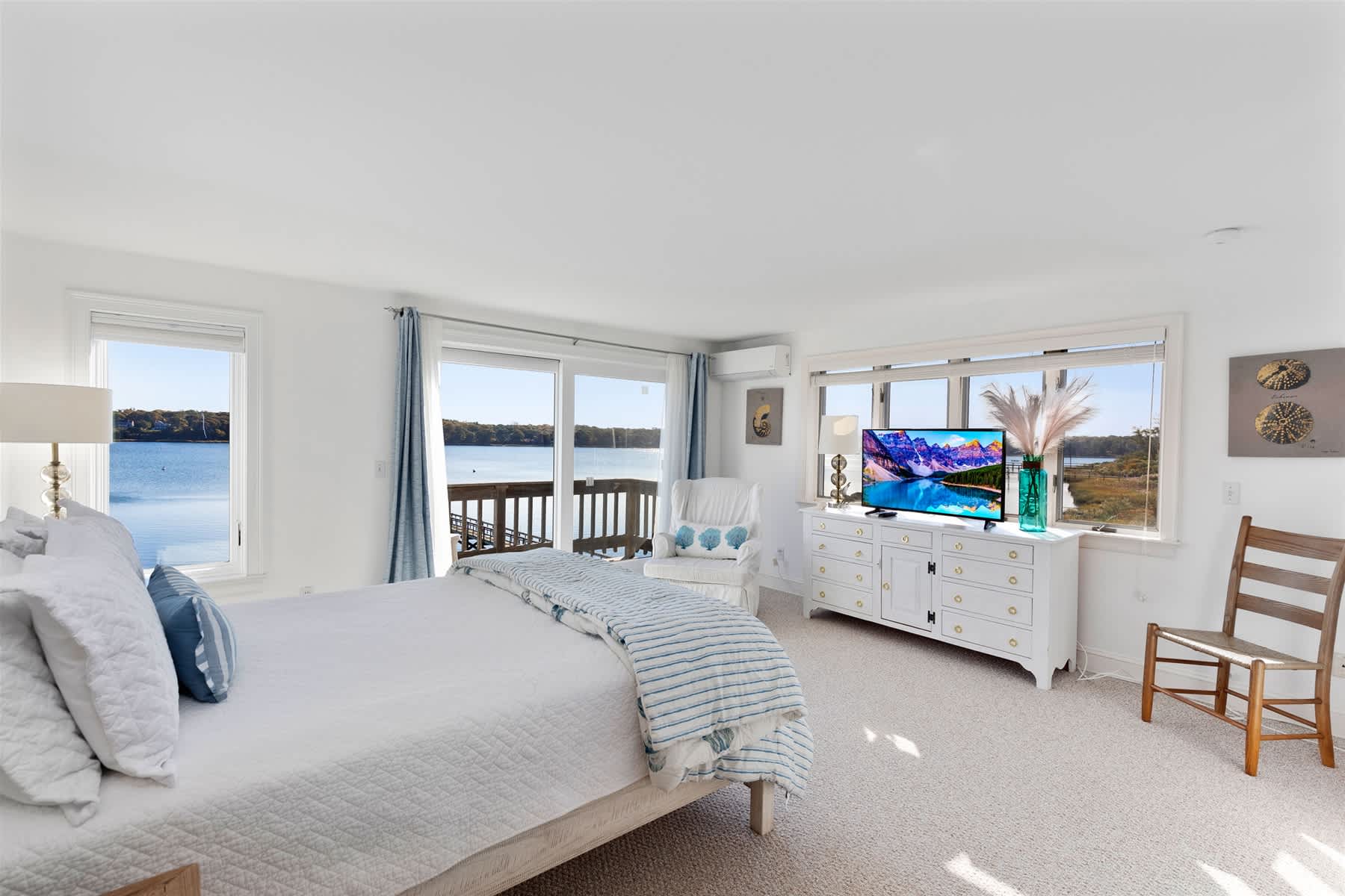 When you finally arrive after a long journey and enter through the bright blue front door, you're greeted by an open concept living room, dining room, and kitchen. The airy space is made bright by a bay window and glass sliding doors that overlook the deck and unbelievable water view beyond. The living room has a classic nautical theme with comfortable seating, and a flat screen TV for your entertainment needs. The dining table has room for eight, and the eat-in kitchen offers additional seating for three. The kitchen also provides a coffee bar, plenty of counter space for meal prep, modern appliances, and all the amenities necessary for the home chef in your group. Outside, you'll discover outdoor living at its finest. Soak up the summer sun in one of the lounge chairs. Spend your evenings cooking dinner on the grill and dining al fresco under the stars. Watch the boats float by from the balcony. Cove's Edge is the perfect home base for your next Cape Cod getaway.