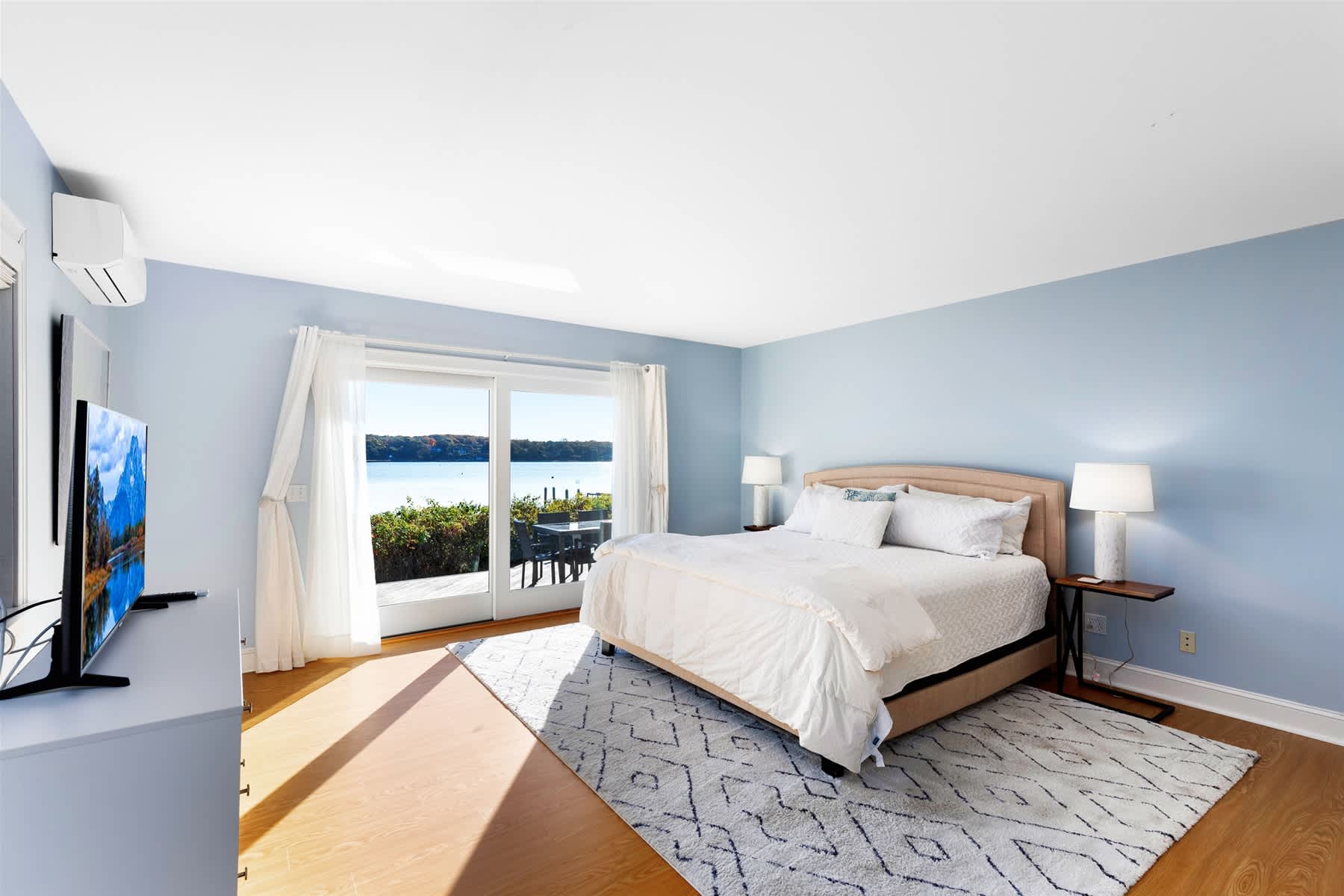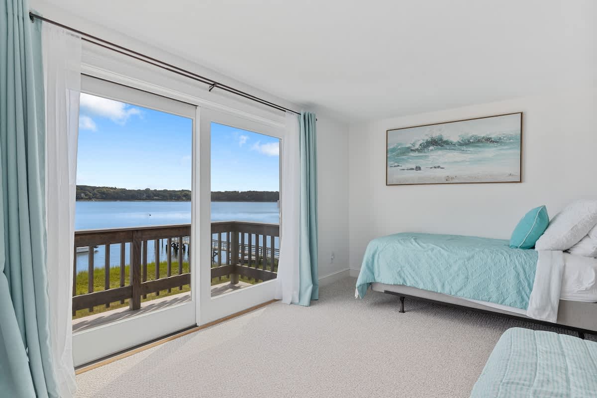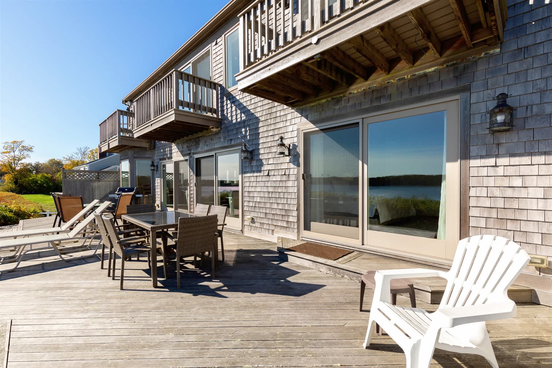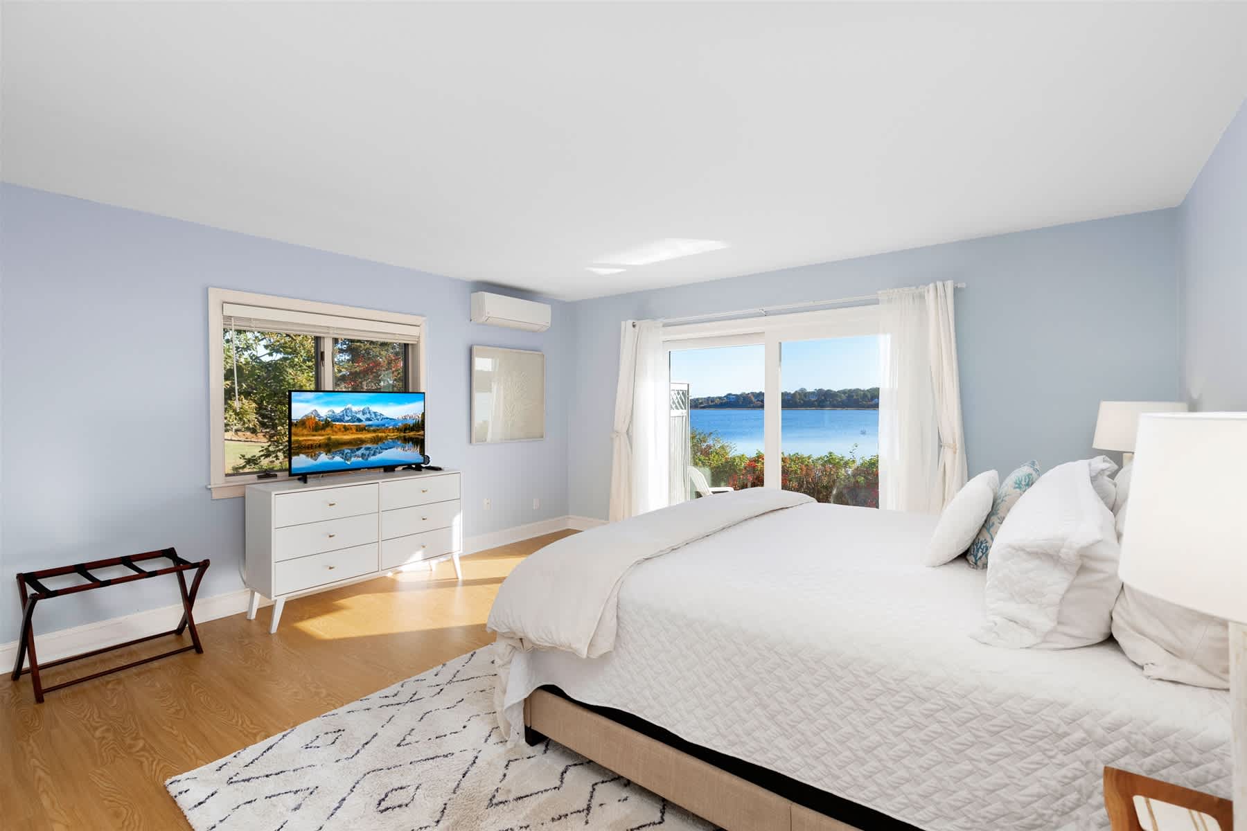 When you finally arrive after a long journey and enter through the bright blue front door, you're greeted by an open concept living room, dining room, and kitchen. The airy space is made bright by a bay window and glass sliding doors that overlook the deck and unbelievable water view beyond. The living room has a classic nautical theme with comfortable seating, and a flat screen TV for your entertainment needs. The dining table has room for eight, and the eat-in kitchen offers additional seating for three. The kitchen also provides a coffee bar, plenty of counter space for meal prep, modern appliances, and all the amenities necessary for the home chef in your group. Outside, you'll discover outdoor living at its finest. Soak up the summer sun in one of the lounge chairs. Spend your evenings cooking dinner on the grill and dining al fresco under the stars. Watch the boats float by from the balcony. Cove's Edge is the perfect home base for your next Cape Cod getaway.
