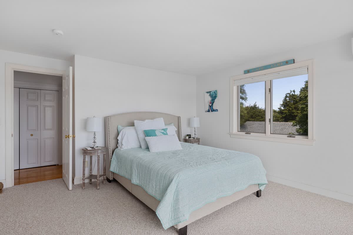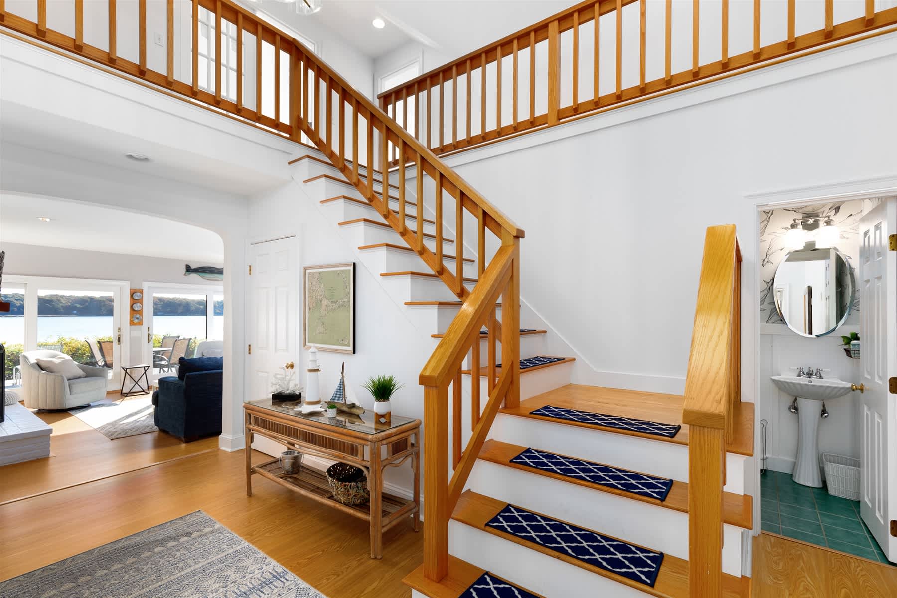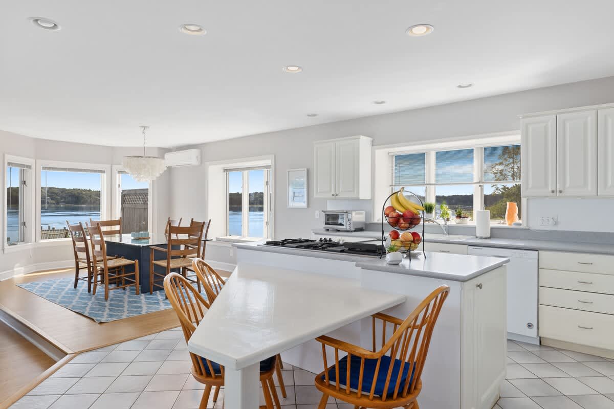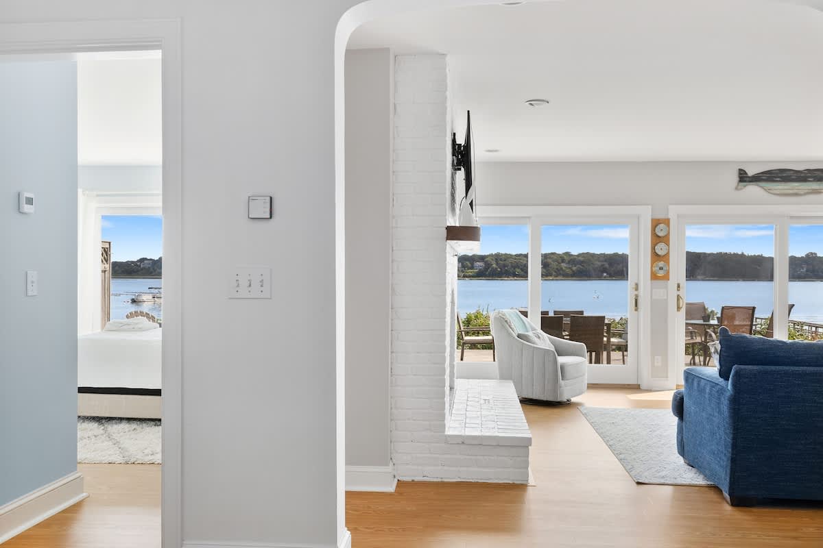 When you finally arrive after a long journey and enter through the bright blue front door, you're greeted by an open concept living room, dining room, and kitchen. The airy space is made bright by a bay window and glass sliding doors that overlook the deck and unbelievable water view beyond. The living room has a classic nautical theme with comfortable seating, and a flat screen TV for your entertainment needs. The dining table has room for eight, and the eat-in kitchen offers additional seating for three. The kitchen also provides a coffee bar, plenty of counter space for meal prep, modern appliances, and all the amenities necessary for the home chef in your group. Outside, you'll discover outdoor living at its finest. Soak up the summer sun in one of the lounge chairs. Spend your evenings cooking dinner on the grill and dining al fresco under the stars. Watch the boats float by from the balcony. Cove's Edge is the perfect home base for your next Cape Cod getaway.