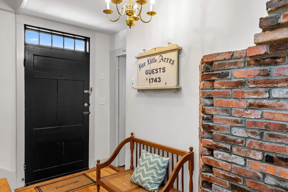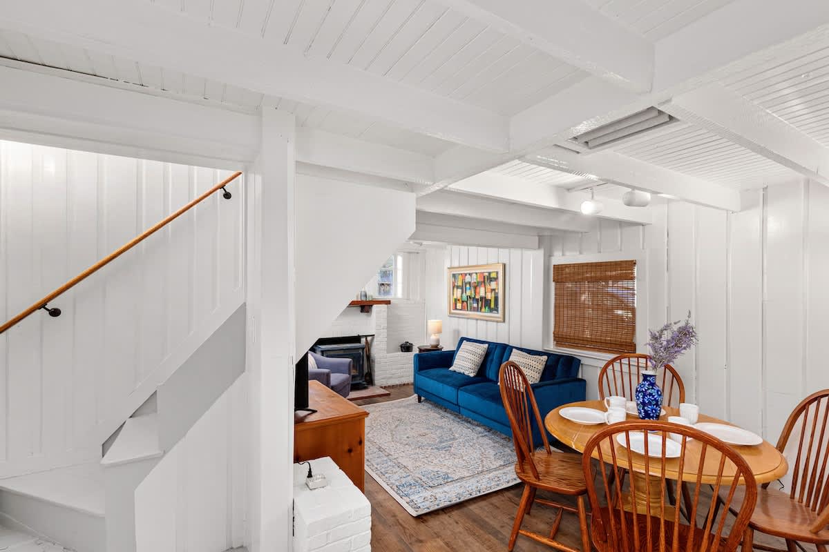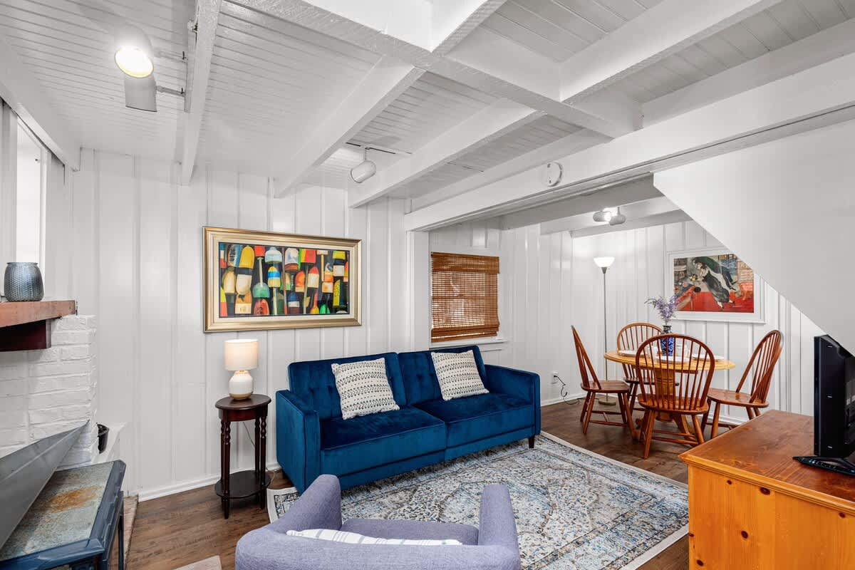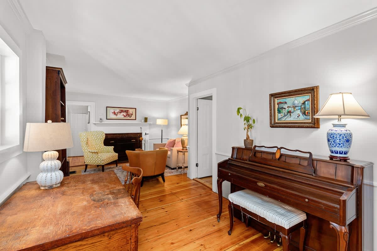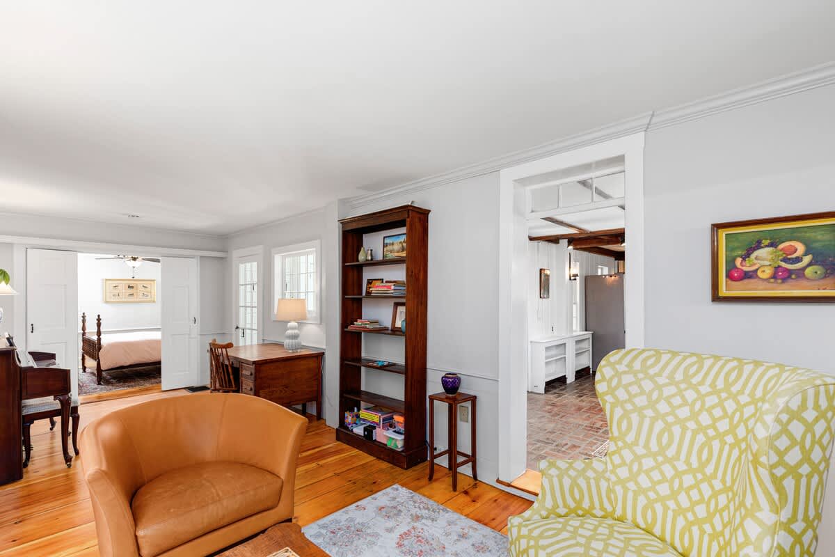 Step inside through the sunroom entrance, where you’ll be greeted by a breathtaking space bathed in natural light from walls of windows and soaring vaulted ceilings. This inviting retreat, with its cozy sectional, smart TV, and charming dining nook, is perfect for slow mornings with coffee or unwinding after a day of exploring. From here, step into the heart of the home—a stunning formal dining room and kitchen where history meets modern elegance. Exposed wooden beams and rustic brick flooring speak to the home’s storied past, while sage green cabinetry and gleaming stainless steel appliances bring contemporary sophistication. Throughout the house, intimate sitting rooms invite quiet moments with a book, and well-appointed bedrooms and bathrooms feature a thoughtfully curated design. Just steps away, the guest cottage offers a bright and welcoming retreat, featuring an open-concept living and dining space adorned with nautical artwork that pays homage to the area’s seafaring history, along with a fully equipped kitchen for added convenience.