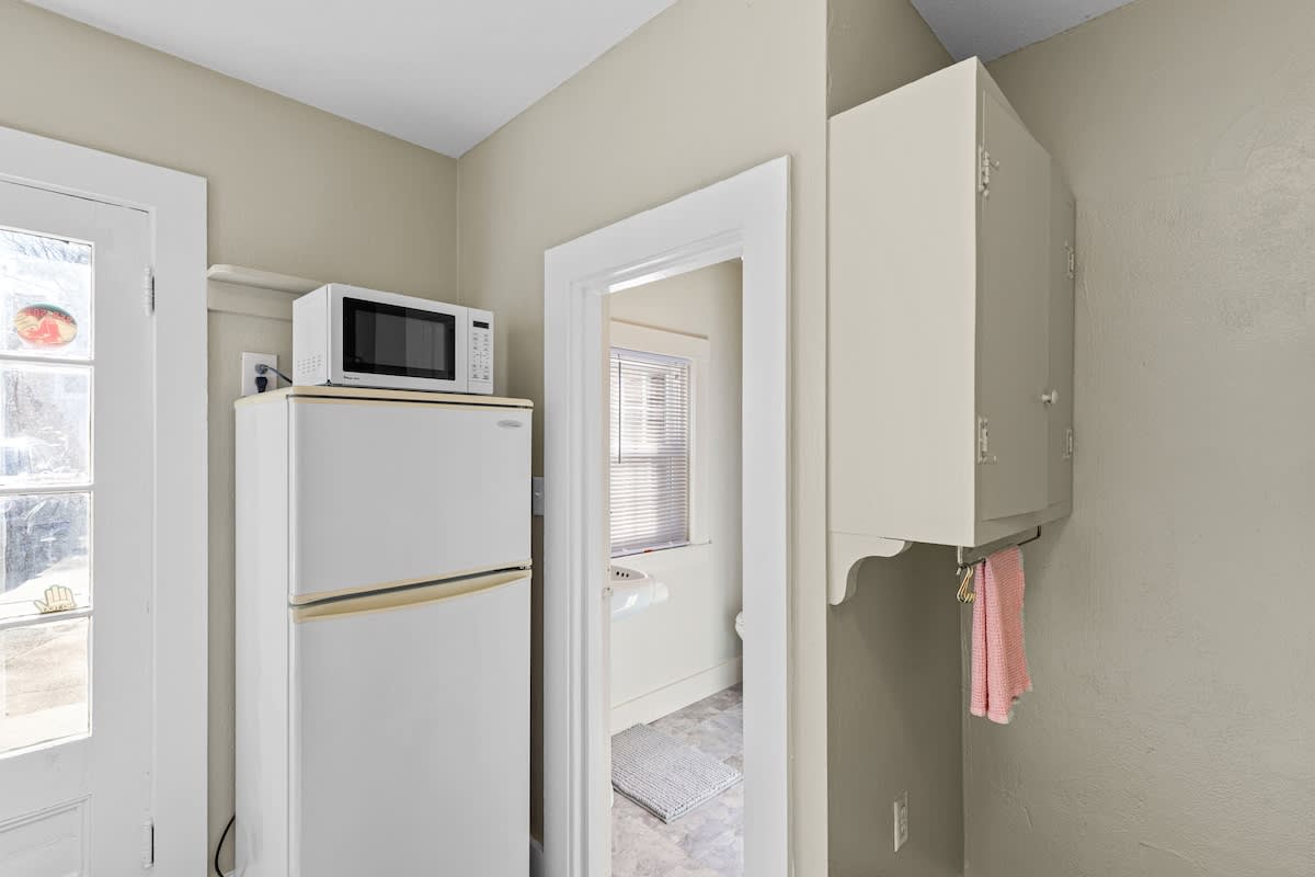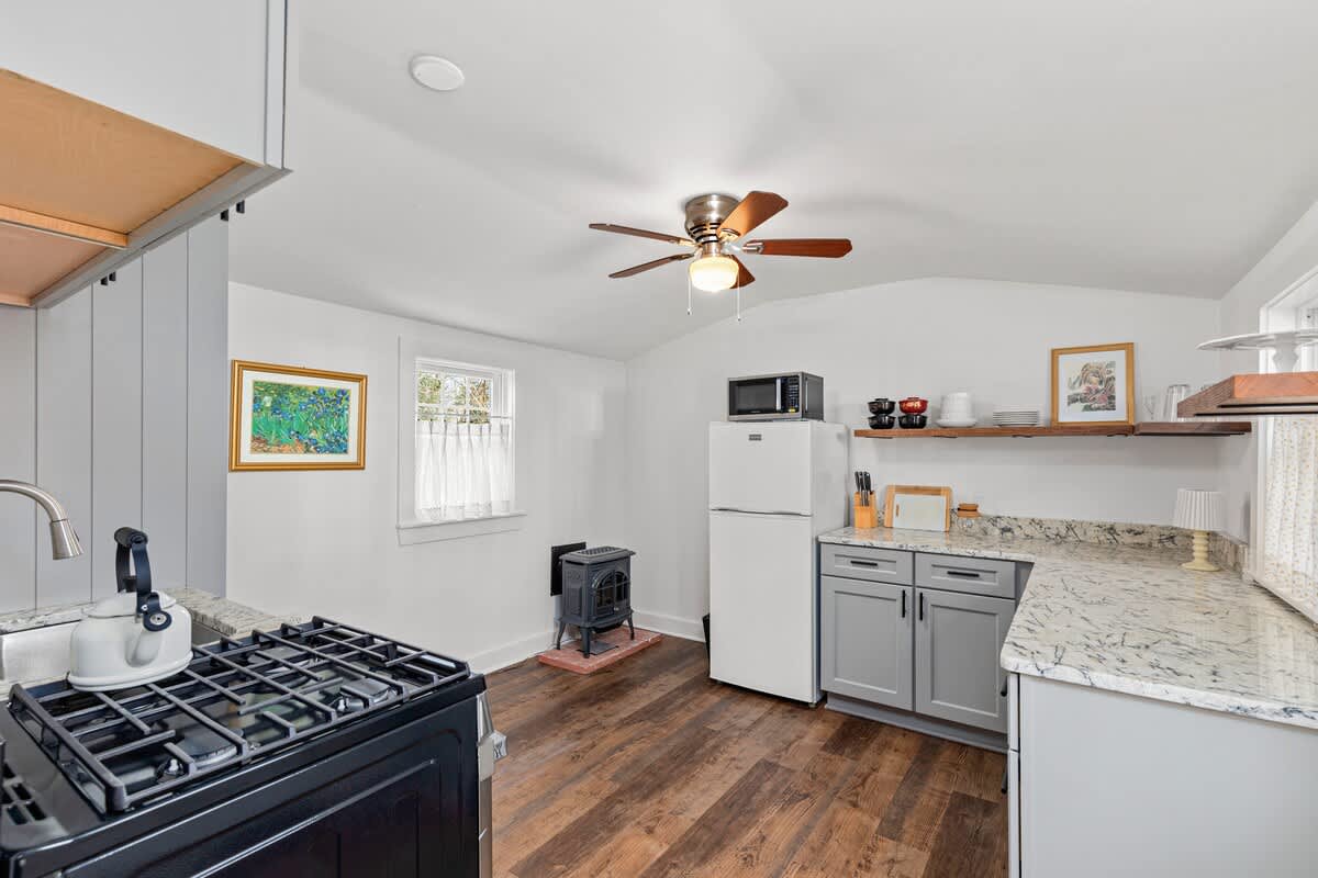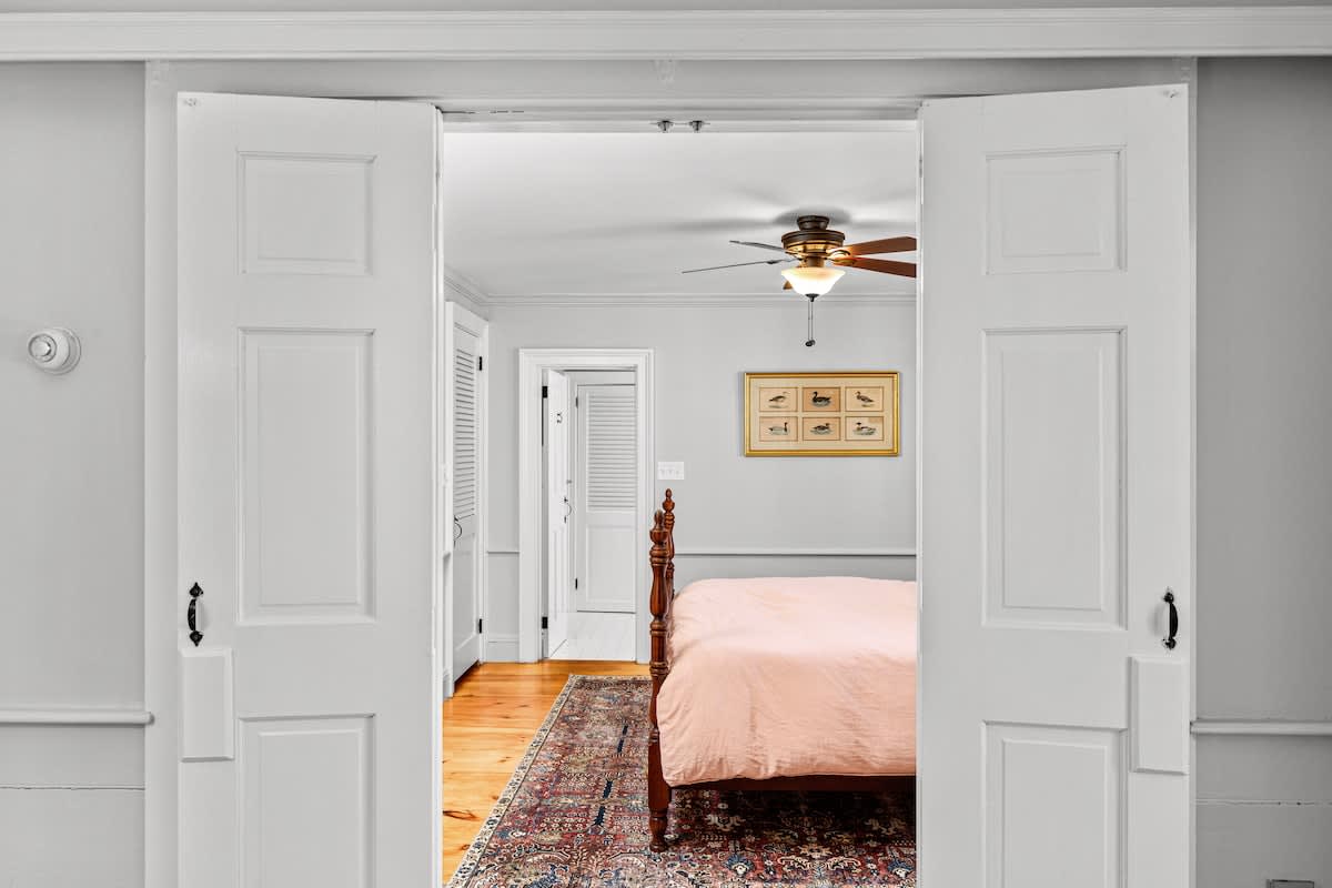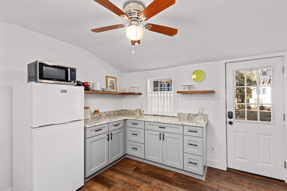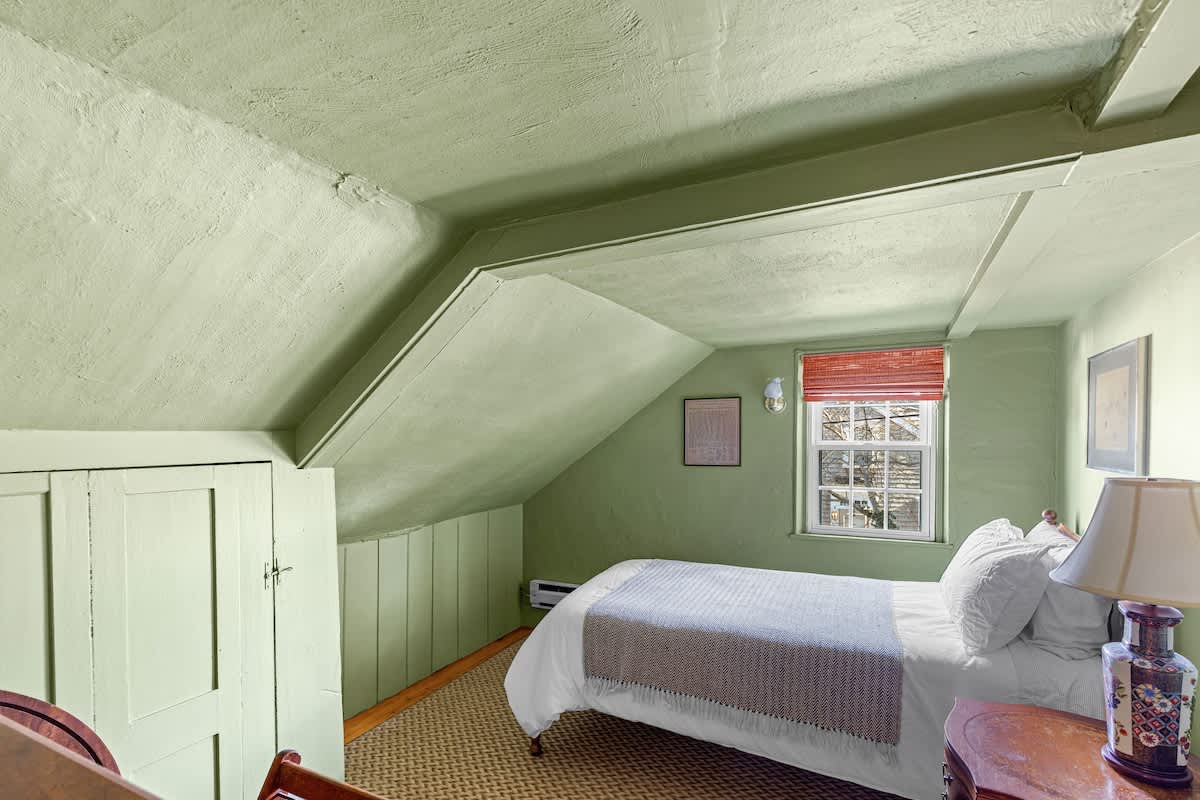 Step inside through the sunroom entrance, where you’ll be greeted by a breathtaking space bathed in natural light from walls of windows and soaring vaulted ceilings. This inviting retreat, with its cozy sectional, smart TV, and charming dining nook, is perfect for slow mornings with coffee or unwinding after a day of exploring. From here, step into the heart of the home—a stunning formal dining room and kitchen where history meets modern elegance. Exposed wooden beams and rustic brick flooring speak to the home’s storied past, while sage green cabinetry and gleaming stainless steel appliances bring contemporary sophistication. Throughout the house, intimate sitting rooms invite quiet moments with a book, and well-appointed bedrooms and bathrooms feature a thoughtfully curated design. Just steps away, the guest cottage offers a bright and welcoming retreat, featuring an open-concept living and dining space adorned with nautical artwork that pays homage to the area’s seafaring history, along with a fully equipped kitchen for added convenience.