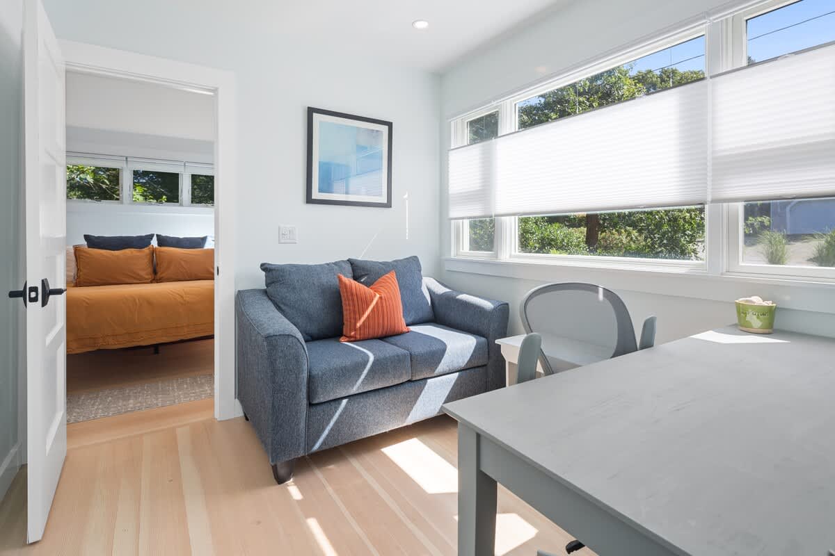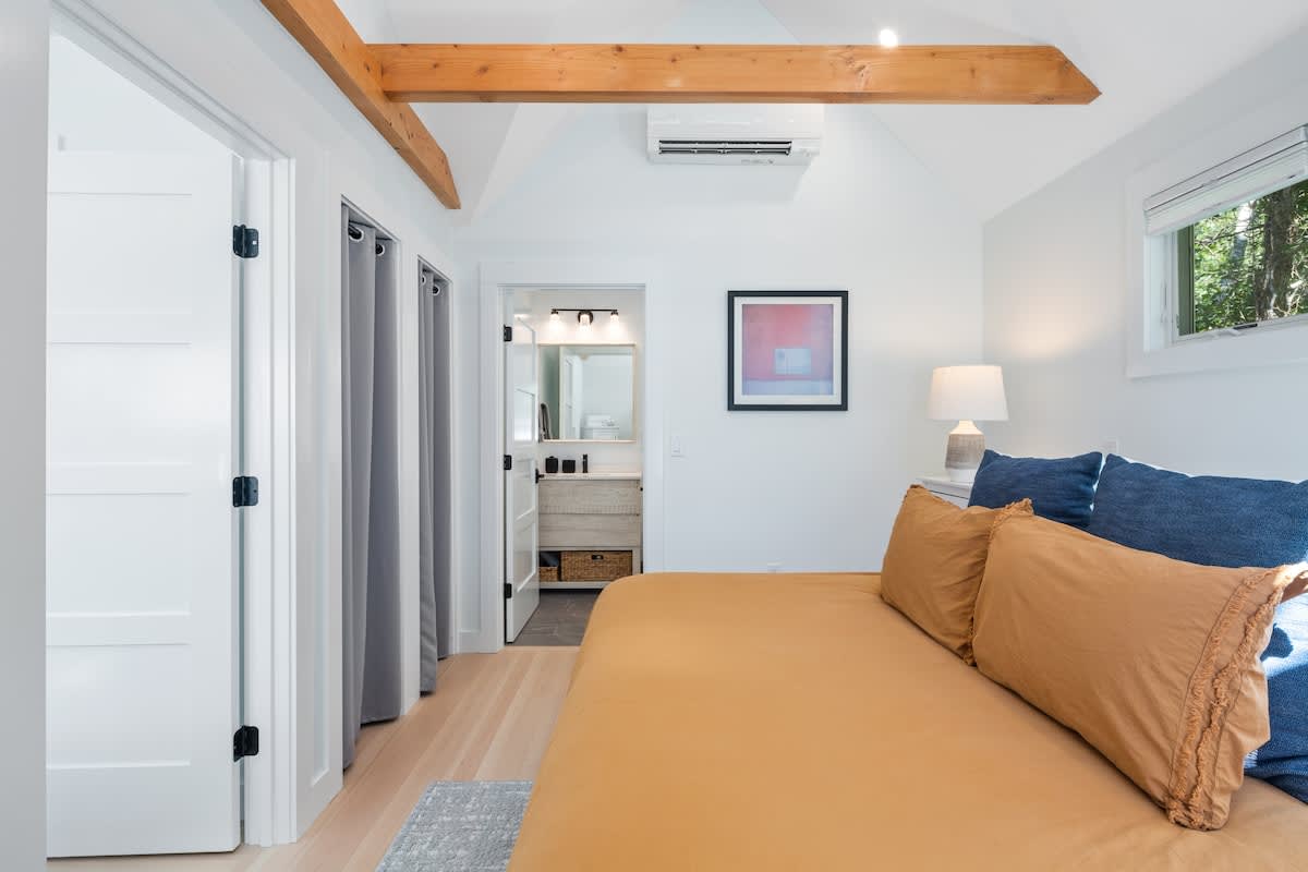 The first bedroom has two twin beds, and they can be combined to make a King to suite your needs. Continue down the hall to a second bedroom, which has a queen bed. Both rooms offer a dresser and a closet for your storage needs. The first bathroom serves these rooms, and has a stand up shower with a glass door. Continuing further through the home, you find a stackable washer and dryer on your left, and an office nook for remote work on your right. At the end of the hall, the lovely primary bedroom with an inviting king size bed reveals itself. The room has vaulted ceilings with a built in fan, as well as a private ensuite bathroom. Cook's Brook Cottage is a wonderful clean space to spend a vacation.