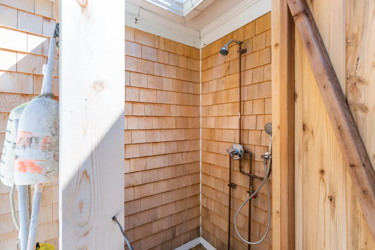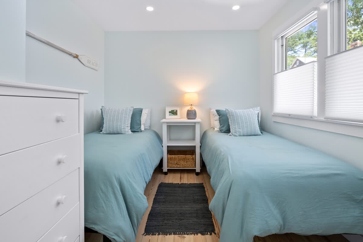 Walking through the front door, you enter the living room. The rooms boasts cathedral ceilings, a new gas fireplace, and gorgeous wooden beams. There is comfortable, sophisticated furnishings and a 43 inch flat screen smart TV. The living rooms flows into the kitchen, where there is seating for two at the counter, perfect for a romantic breakfast. The bright white room has a beautiful deep blue tile backsplash, and modern appliances. Off of the kitchen, you find a sun porch that is utilized as a dining room. The table is extendable so the whole family can gather around. Outside, there is a fenced in yard and a sizeable deck with a gas grill, outdoor dining table, adirondak chairs, and two large tilting umbrellas for shade. Another fantastic outdoor amenity is the completely enclosed outdoor shower, which is a wonderful place to rinse away the sand after a long day at the beach!