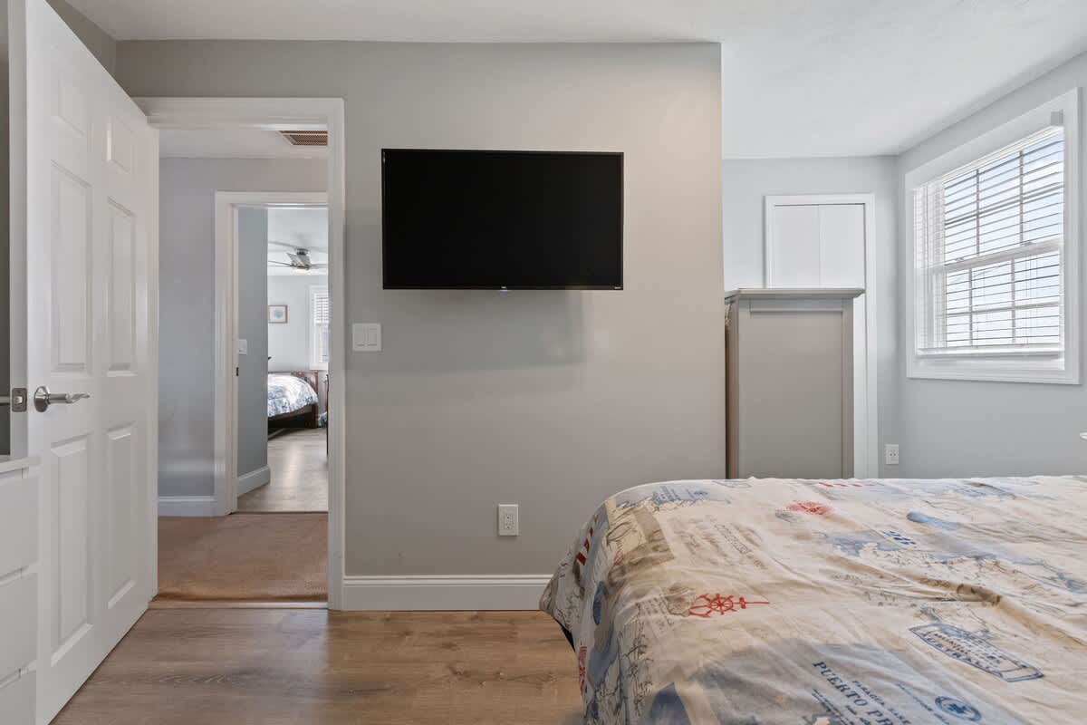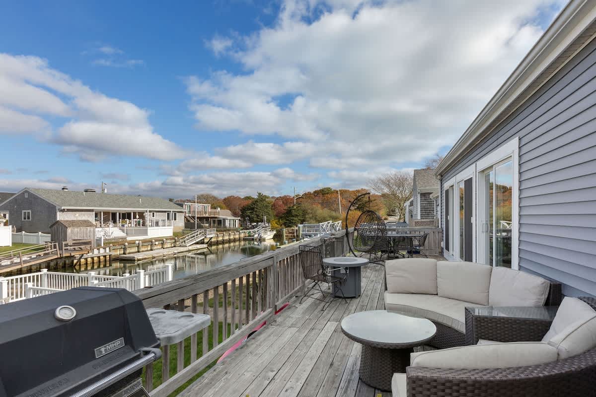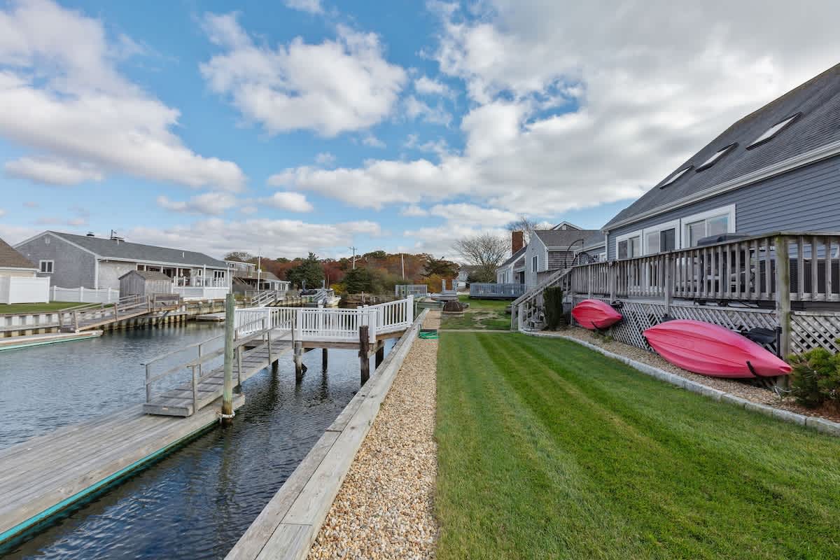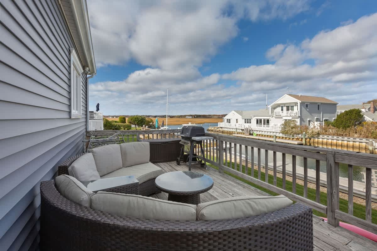 While the location of Dockside Delight is an outdoor enthusiasts dream come true, the interior of the home is equally alluring. The main living space is bright and inviting, with soaring cathedral ceilings and a wall of glass sliding doors. Views of the back deck, private dock, and saltwater beyond sets the stage for a dream Cape Cod vacation. There is an additional more intimate sitting area as well, so groups of up to eight can spread out comfortably here. Two dining tables make hosting family meals a breeze. The bright white kitchen is well equipped with stainless steel appliances. Upstairs, you'll discover four well appointed bedrooms with a charming nautical flare. Each room has its own wall mounted TV for your entertainment needs.