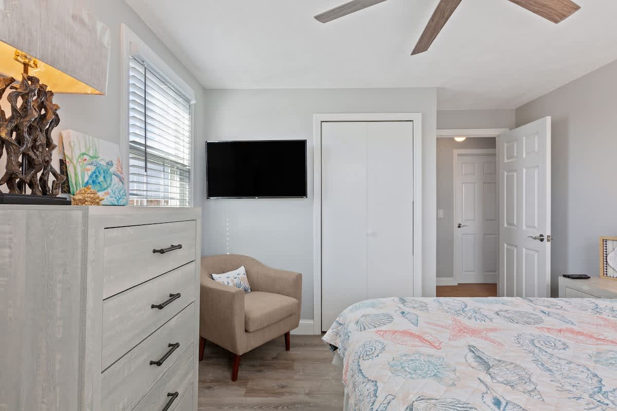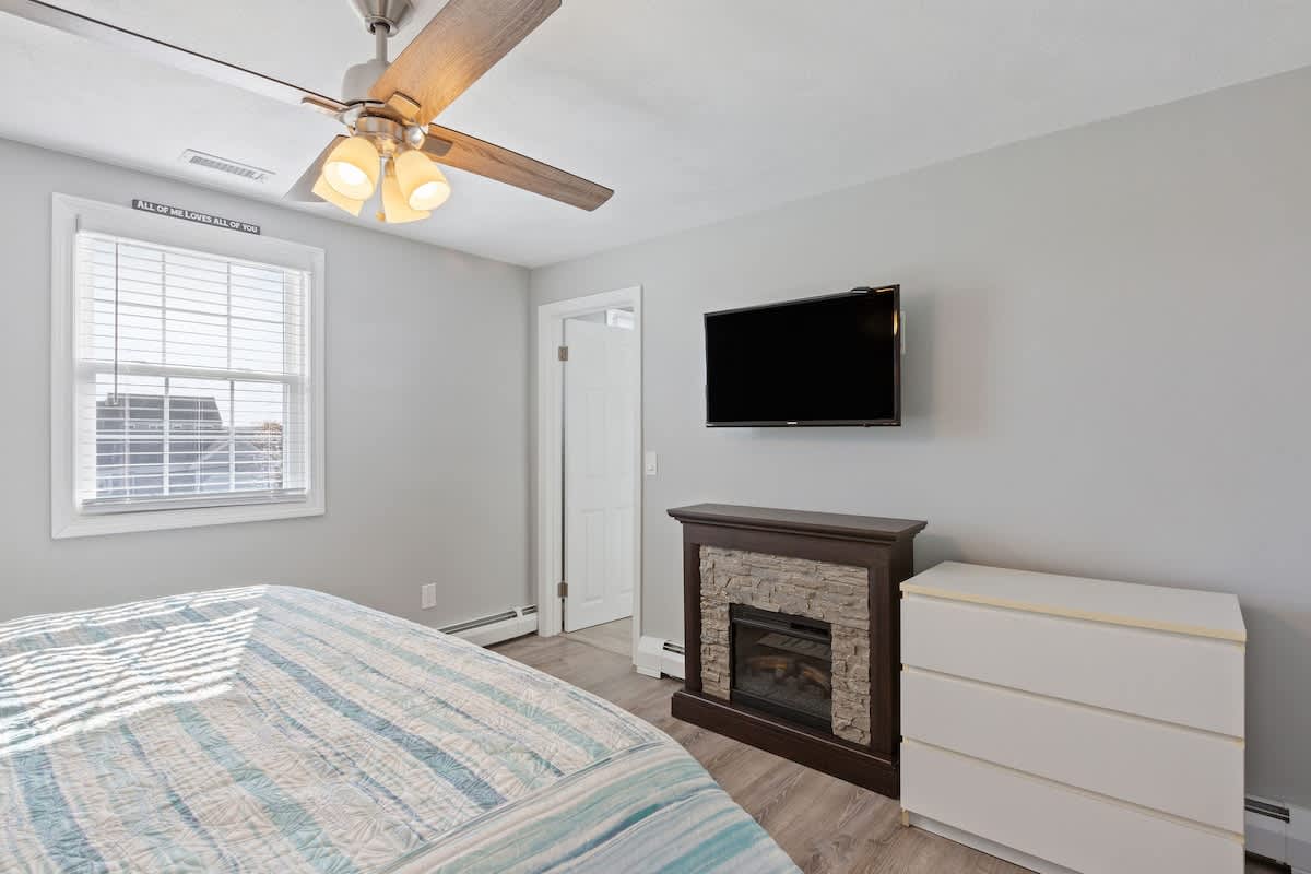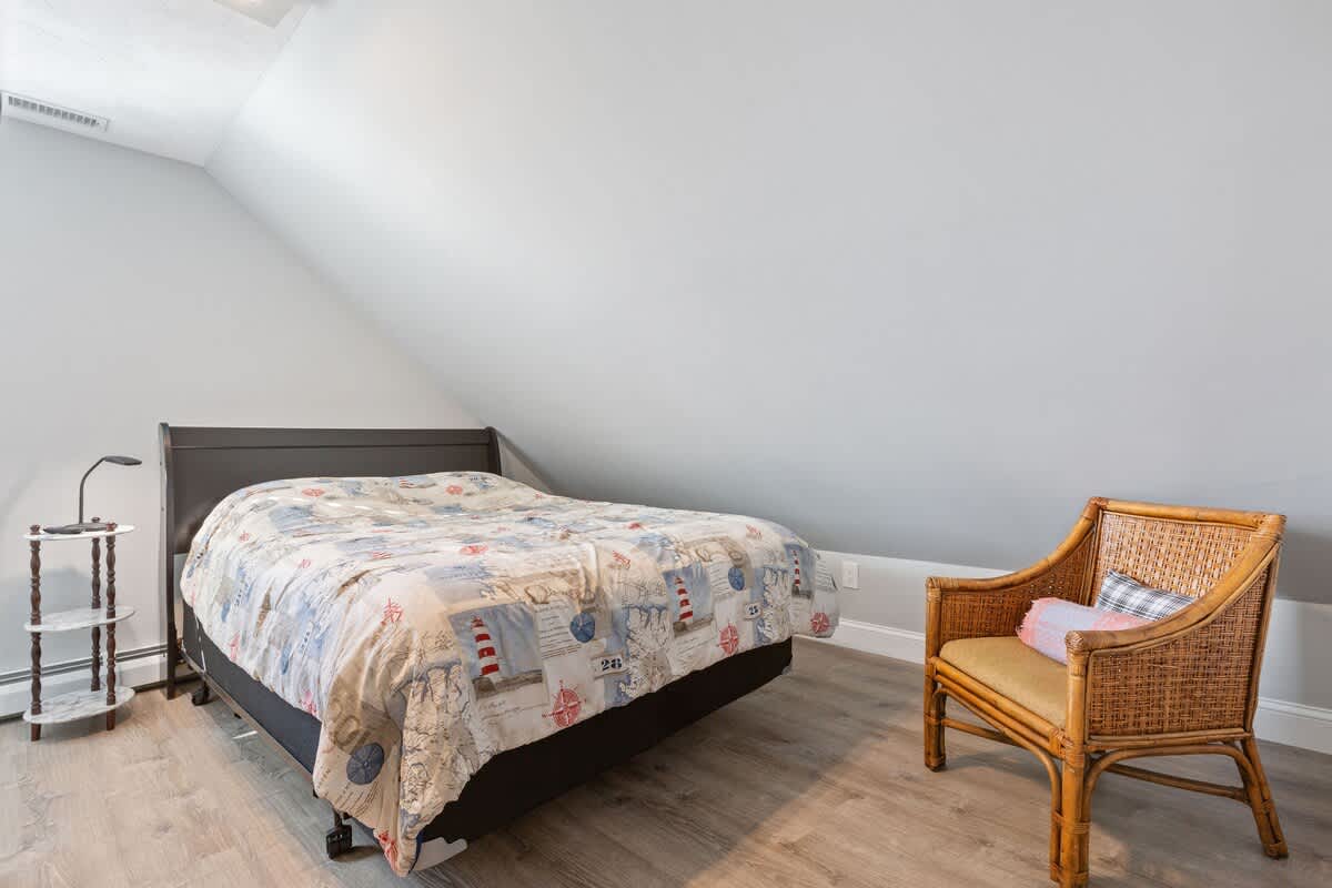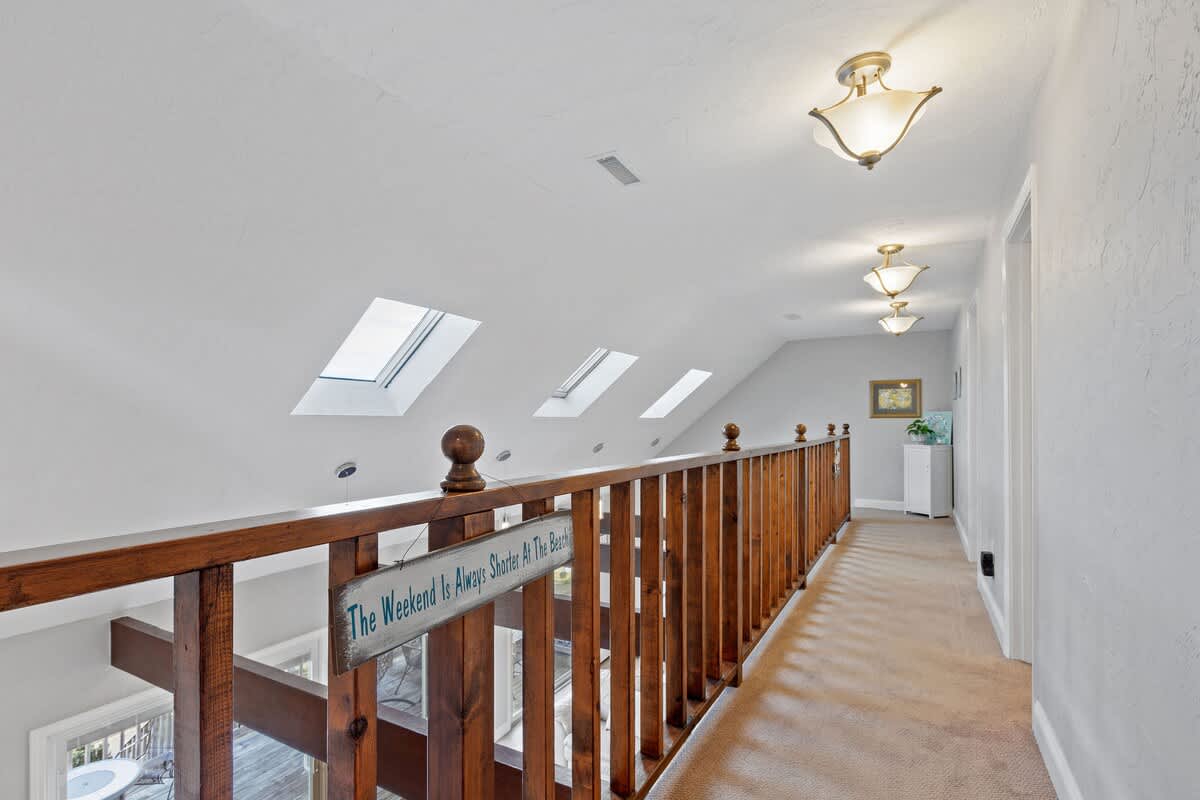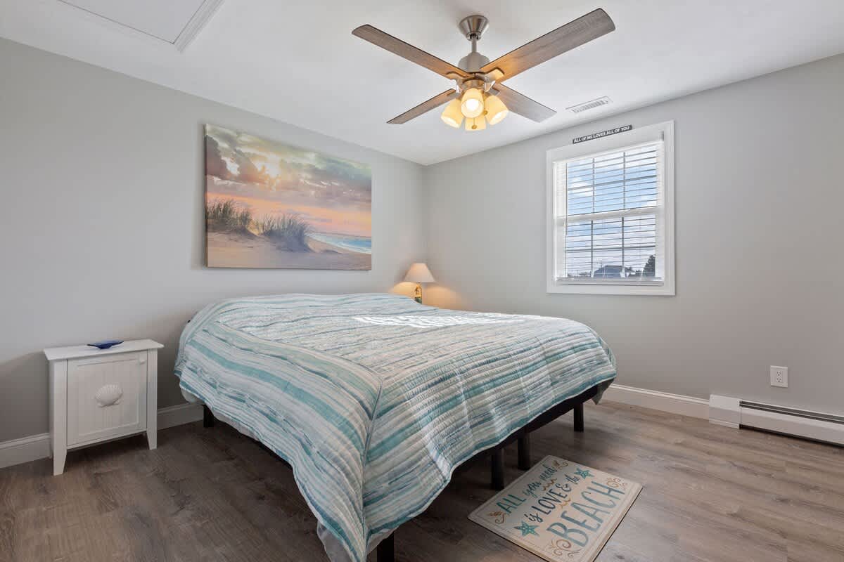 While the location of Dockside Delight is an outdoor enthusiasts dream come true, the interior of the home is equally alluring. The main living space is bright and inviting, with soaring cathedral ceilings and a wall of glass sliding doors. Views of the back deck, private dock, and saltwater beyond sets the stage for a dream Cape Cod vacation. There is an additional more intimate sitting area as well, so groups of up to eight can spread out comfortably here. Two dining tables make hosting family meals a breeze. The bright white kitchen is well equipped with stainless steel appliances. Upstairs, you'll discover four well appointed bedrooms with a charming nautical flare. Each room has its own wall mounted TV for your entertainment needs.