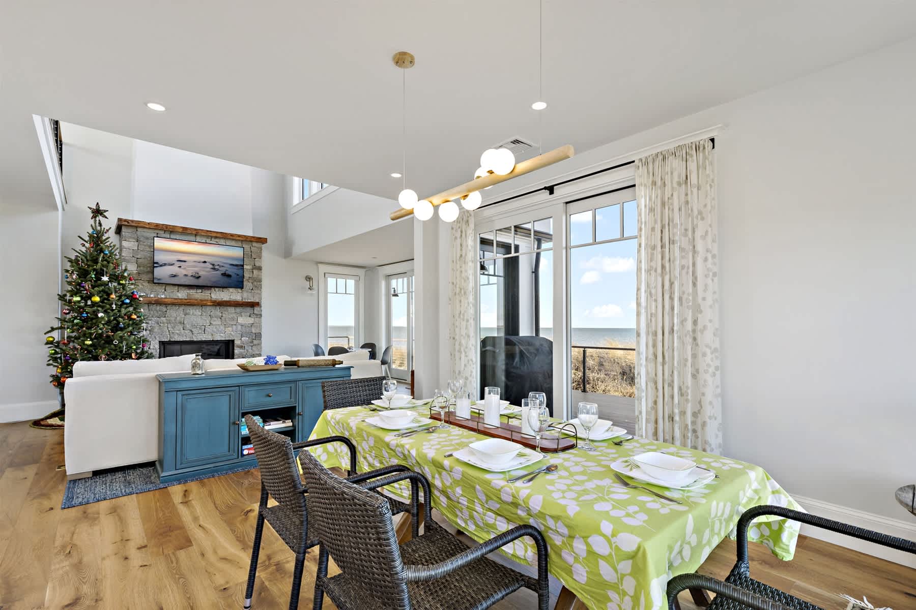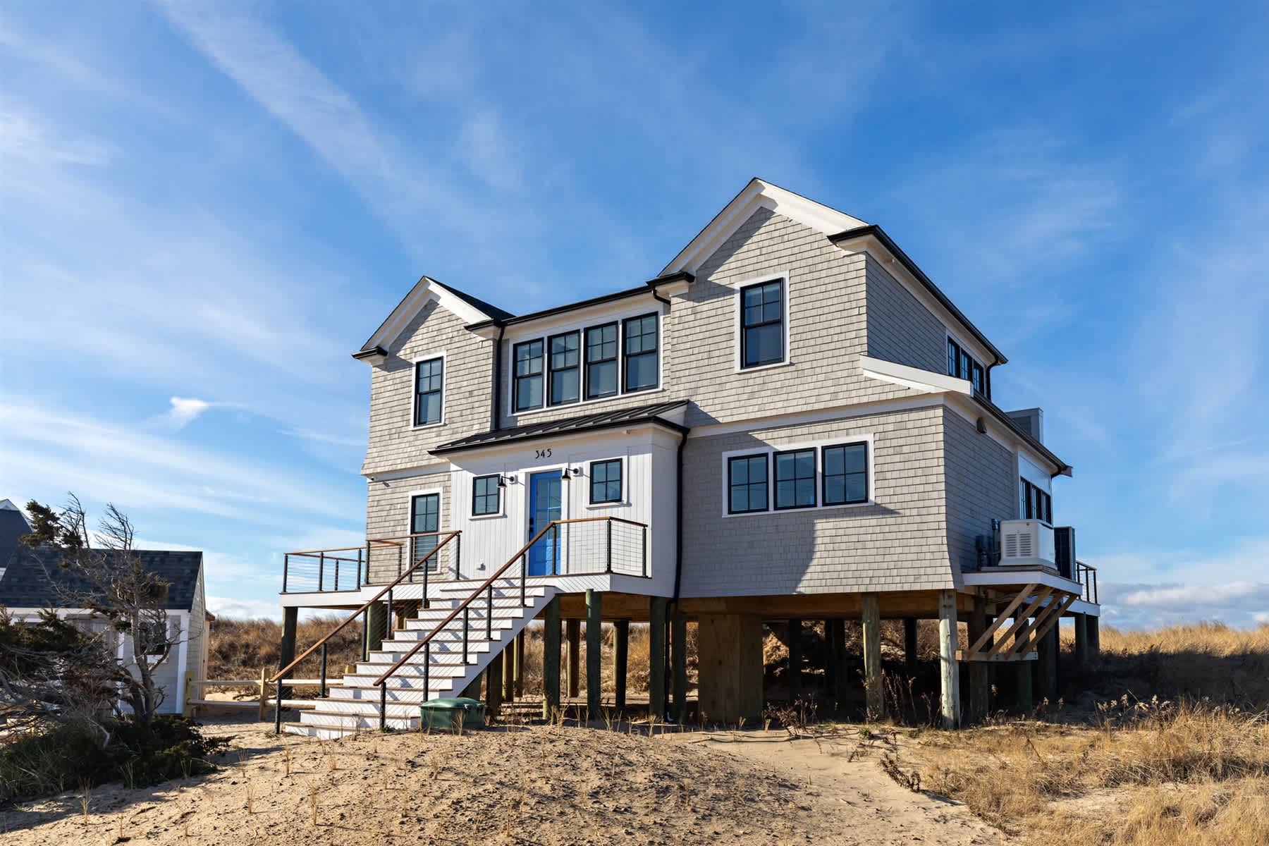 Welcome to Sunset Lookout, a brand new waterfront home on Eastham's postcard perfect Sunken Meadow Beach. Nestled in a unique and highly coveted community, you will find this dream retreat perched high on pilings, overlooking both Cape Cod Bay and the expansive, biodiverse marshland of Sunken Meadow. Every room in this well appointed home offers modern coastal luxury paired with breathtaking views. The epitome of a perfect Cape Cod getaway begins here, with the sandy shores and salty air of a private beach right outside your doorstep.