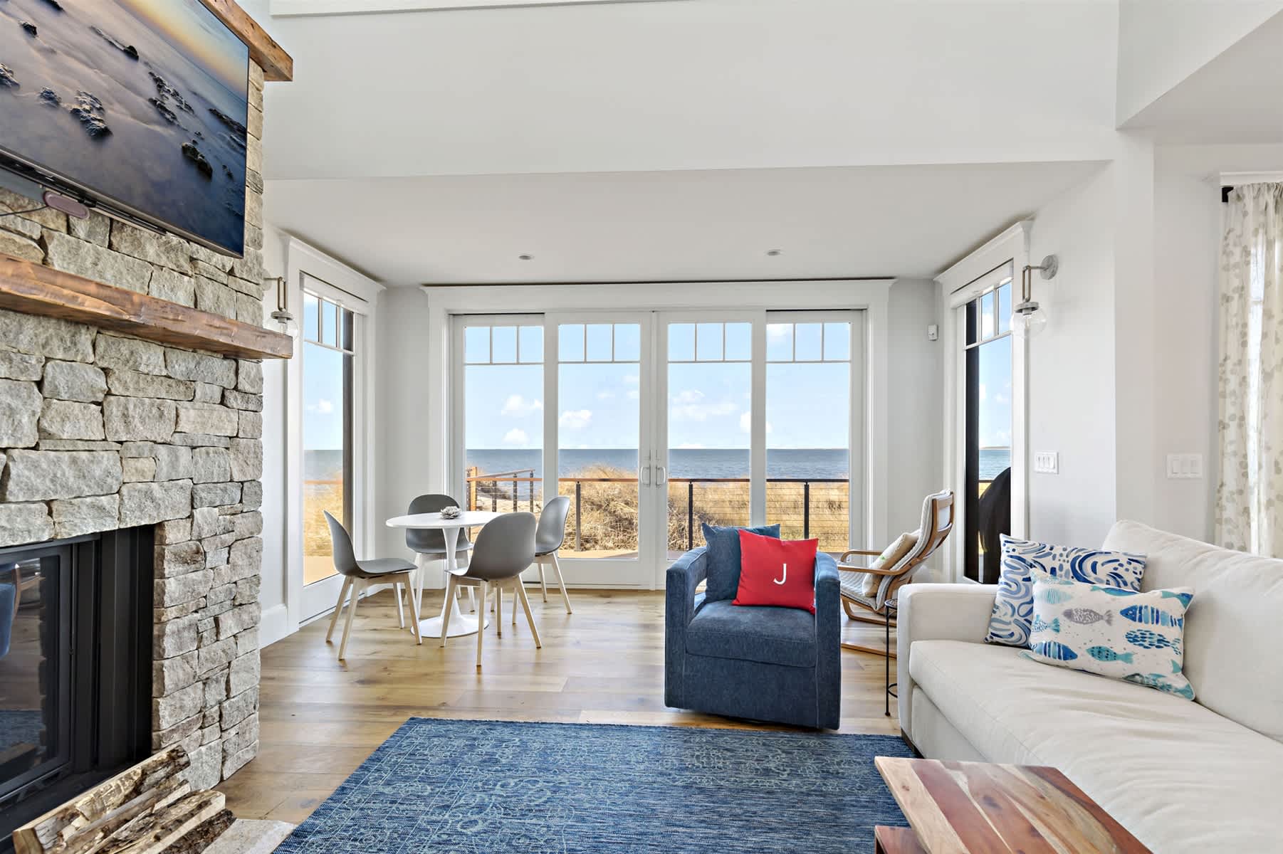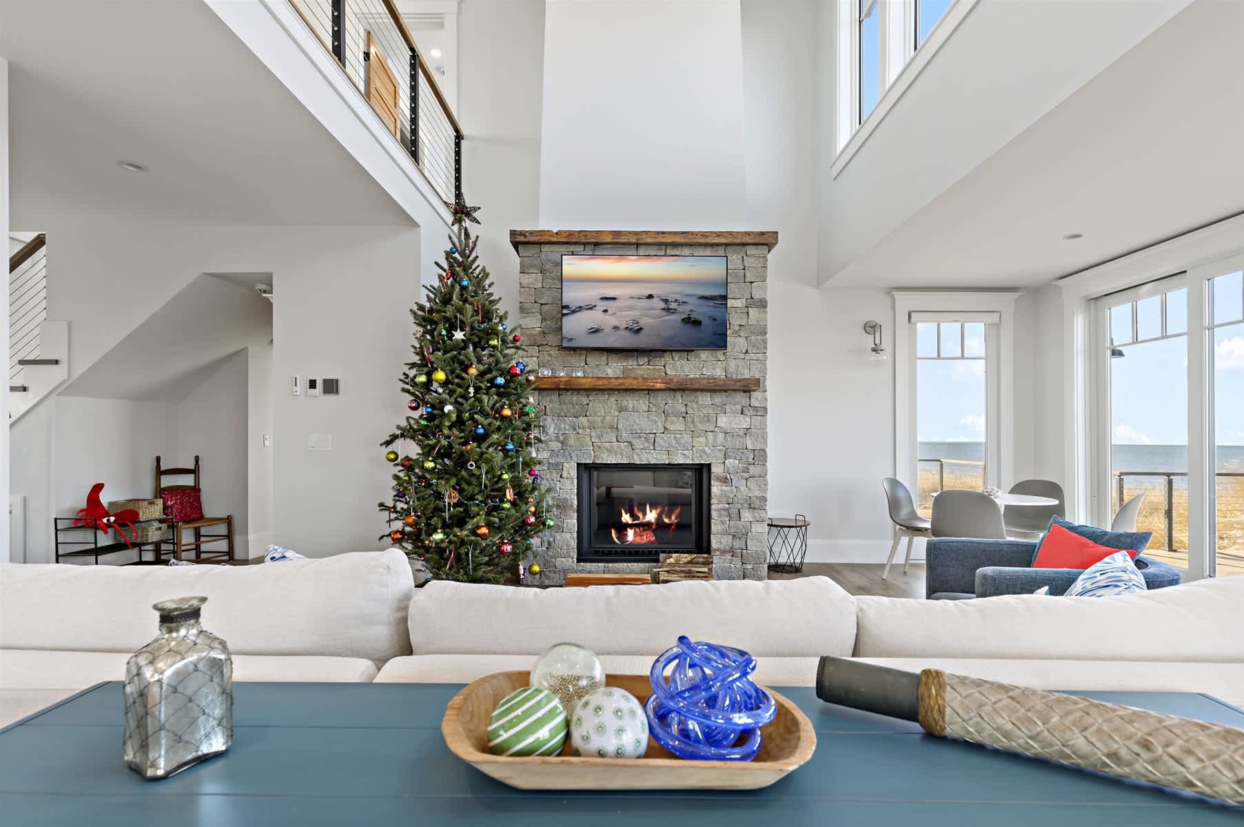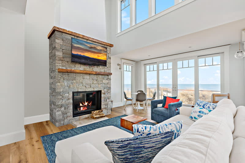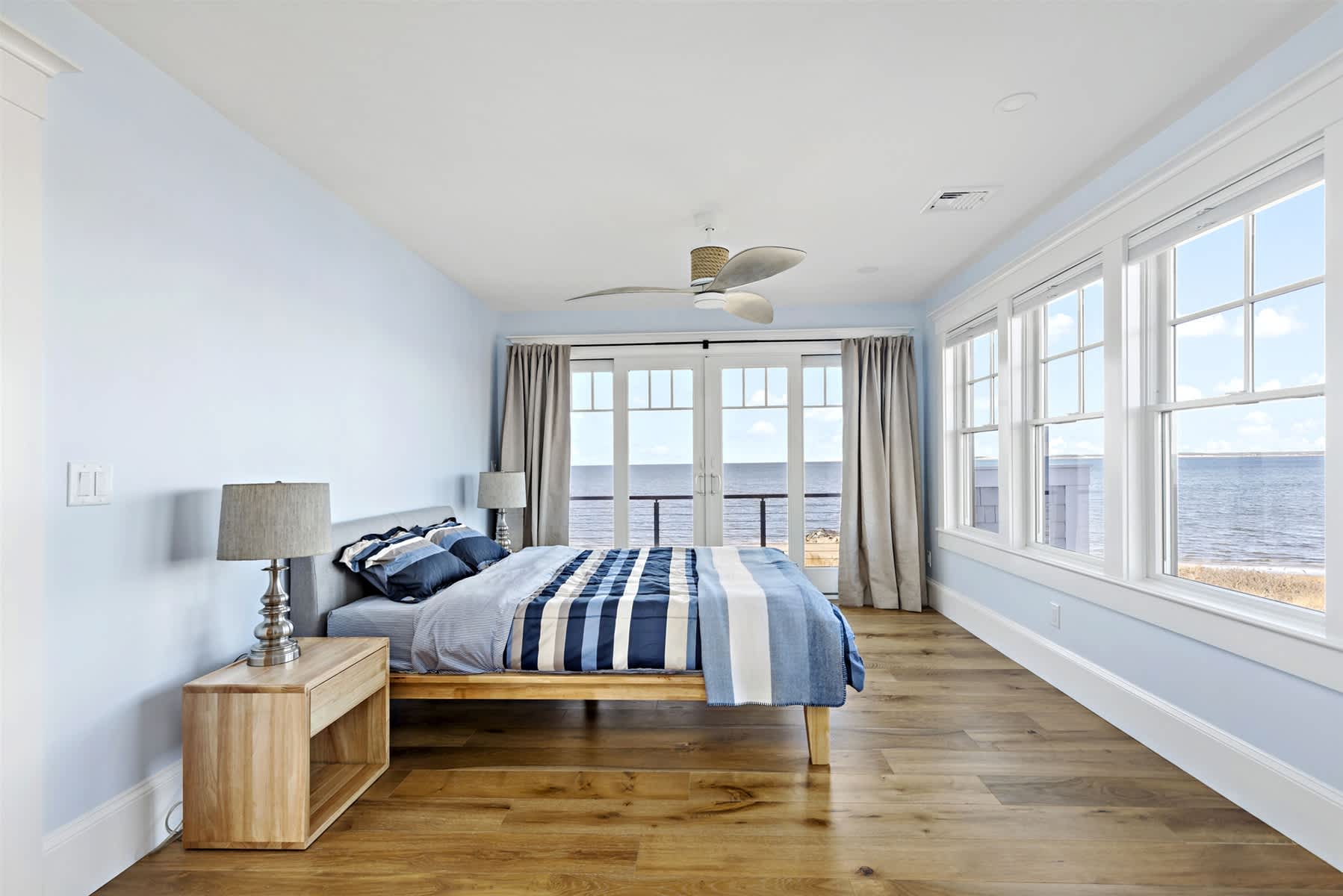 As you step inside, you discover a thoughtfully designed open concept living room, dining room, and kitchen. Windows flood each space with natural light, and offer an amazing vantage point for watching spectacular bayside sunsets. The living room features soaring ceilings, a charming stone fireplace, and a wall mounted smart TV for movie night. The eat in kitchen is bright and inviting, with top of the line stainless steel appliances and an abundance of amenities that cater to the discerning home chef. The dining room connects these spaces, and offers access to the back deck that runs the length of the home on both levels. The striking, oppulent nature of the property continues in each of it's well designed 3 bedrooms and 3.5 bathrooms.