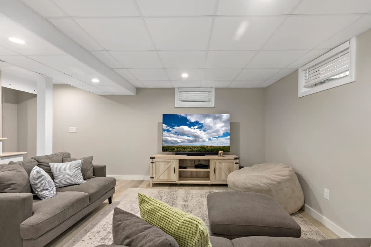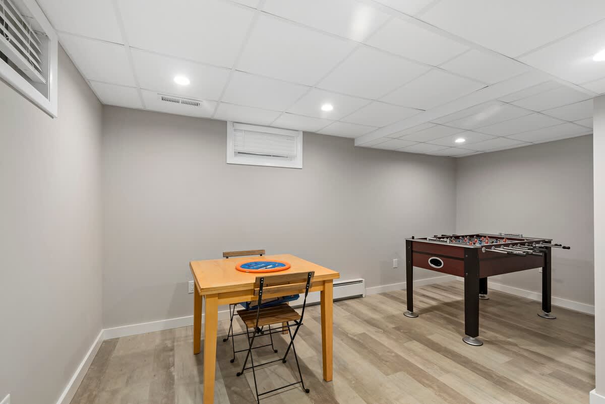Entering the home, you are met with a lovely open concept eat-in kitchen and living room. There are brand new stainless steel appliances, and a myriad of kitchen amenities sure to please the cooking connoisseur in your group. The cozy living room invites you to relax on the sectional sofa. Additional living space can be found in the home's spacious finished basement. There is so much fun to be had there - play a round of foosball, a game of cards, or watch a movie on the 60 inch flat screen smart TV! There is plenty to do when its time to head outdoors as well. Enjoy the bliss of an outdoor shower after a day at the beach. Grill a delicious meal on the deck and dine al fresco, or get the family together for some s'mores around the fire pit in the evenings. The kids can escape to their very own backyard playhouse where they'll make fond memories to reflect on for years to come.