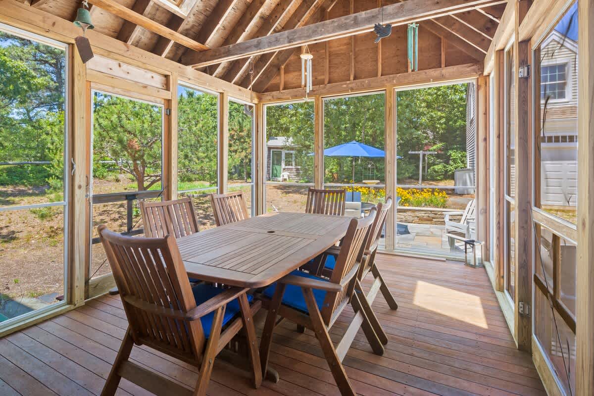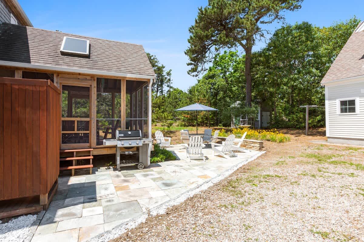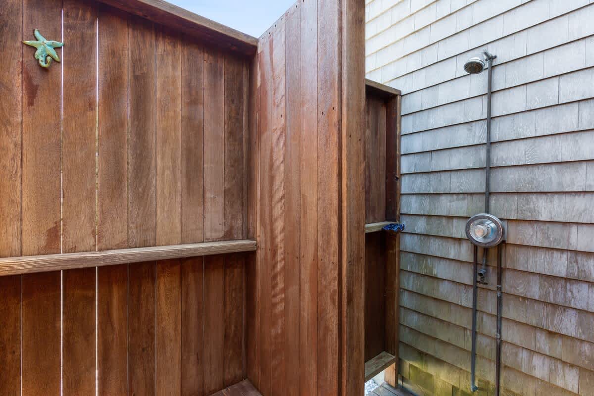 The outdoor amenities at Endless Summer are truly what makes this property shine! Stepping outside from the dining room, find yourself in the beautiful 16'X16" wooden screen in porch. It is the perfect place to gather and share delicious food prepared on the gas grill. There is a table that seats six, and you can enjoy your meals al fresco in the shade. Beyond the porch is a gorgeous stone patio, offering additional seating at the table with an umbrella. There are adirondack chairs perfect for reading a book or catching a tan. An enclosed outdoor shower is available for a rinse after a long day at the beach.