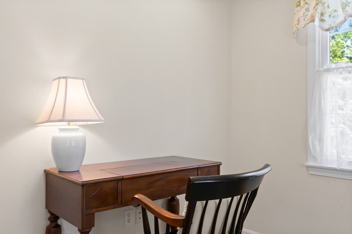 The exterior of the home, with it's soft yellow color and pretty window boxes, gives a cheery and welcoming feeling. Entering through the front door, you find yourself in the living room. The space has cozy leather furniture and a flat screen TV. The whole first floor is open concept, and the living room flows into the dining room, then the kitchen. There is seating for six at the dining table, with an additional three seats at the kitchen peninsula. Bring the kids along, and you will find they get their own adorable table as well. The kitchen is spacious, with plenty of counter space and storage. First floor laundry with a brand new washer and dryer is offered for your convenience right off of the kitchen. All three attractive and comfortable bedrooms are located on the second story.