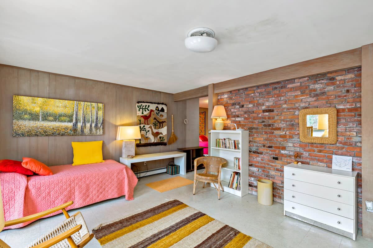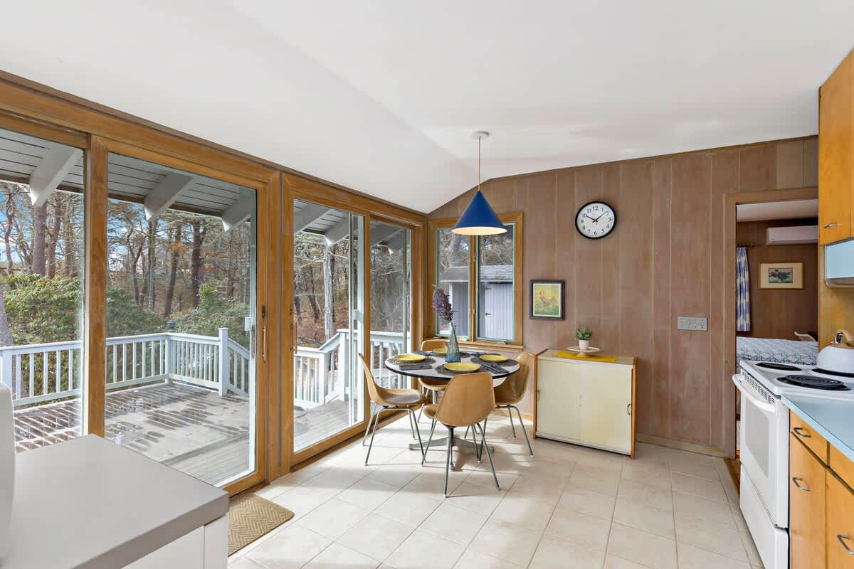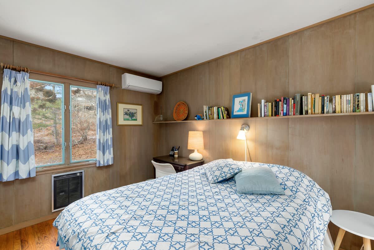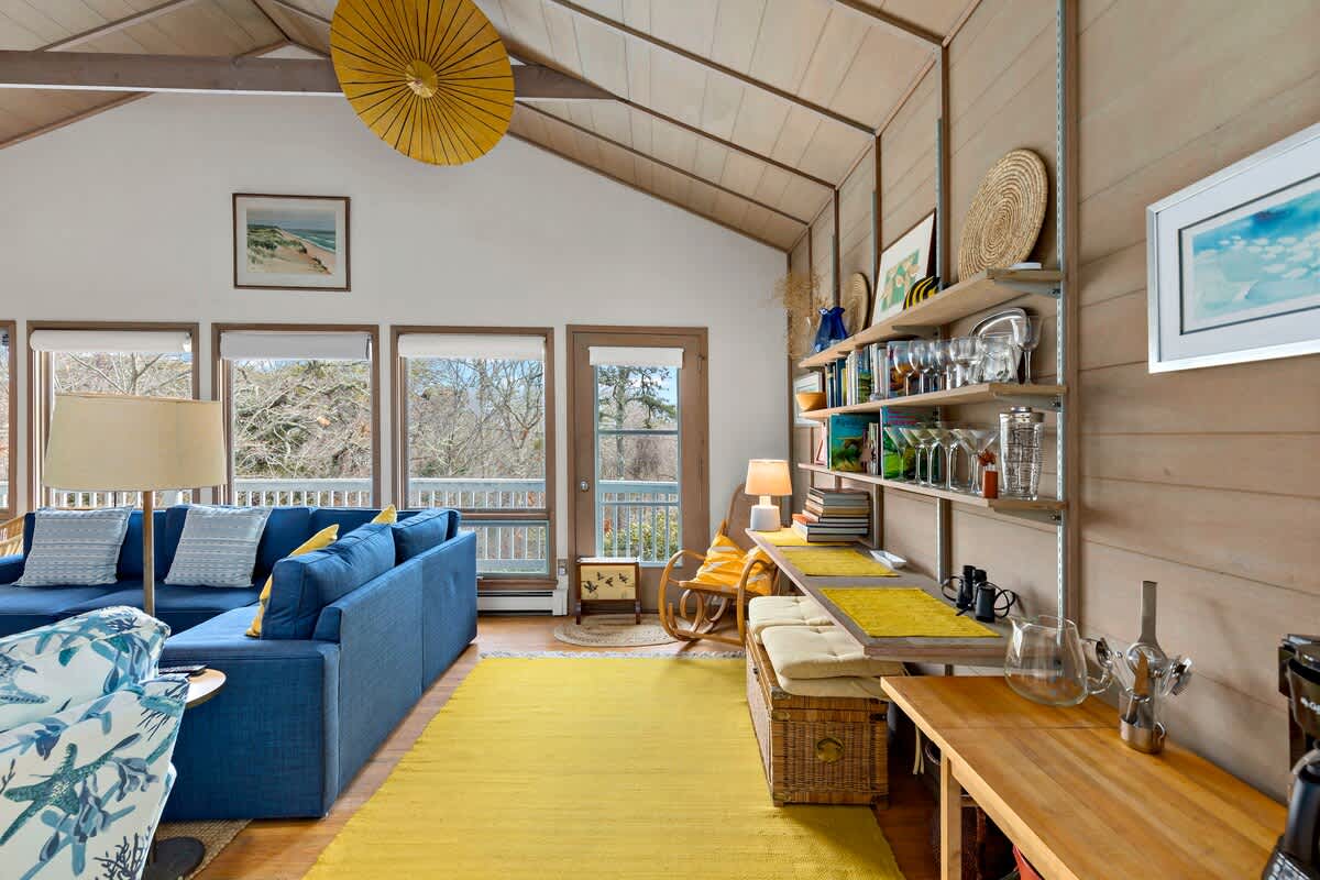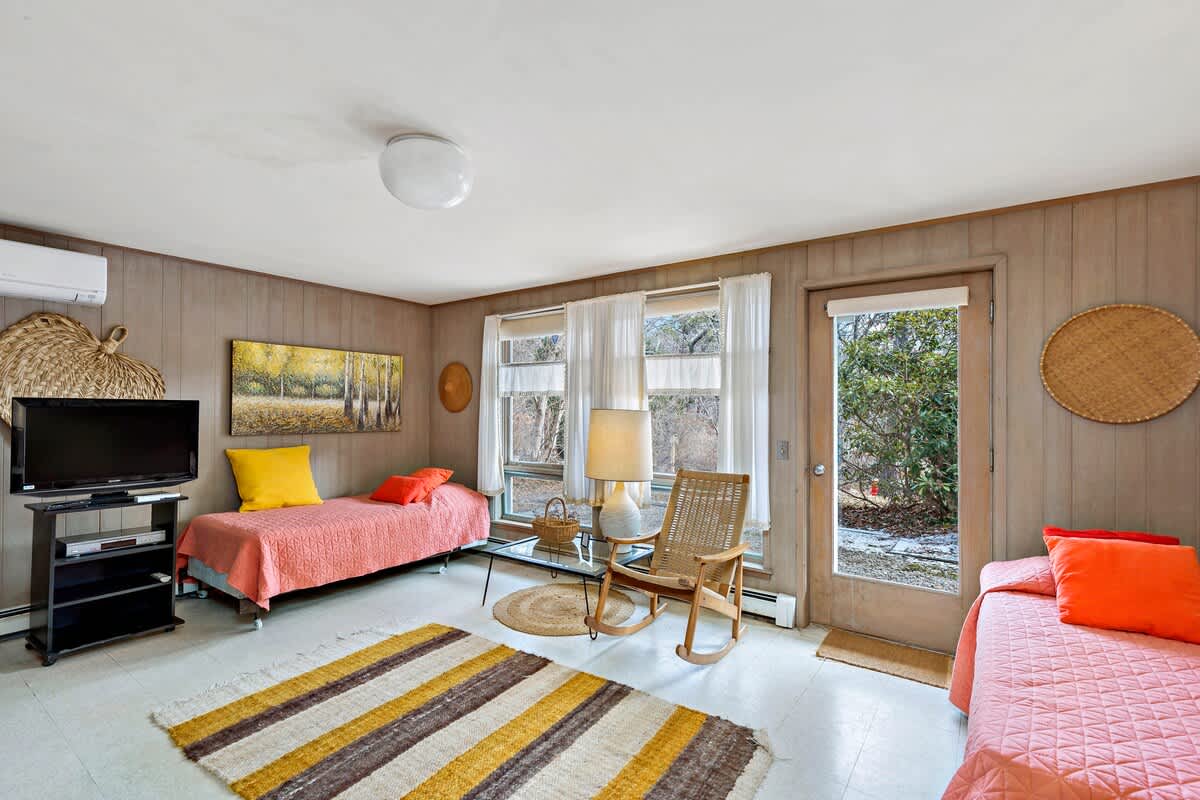 When you pull up the driveway and around to the back of the house, you’ll be greeted by a gorgeous new back deck. It’s the perfect spot to soak up the sunshine, surrounded by whispering pitch pines. Inside, the charming kitchen is fully stocked with everything a discerning home chef might need (lobster pot included!). The kitchen features an intimate dining table, perfect for a quick breakfast before heading to the beach or enjoying a game of cards in the evenings. From here, you can look into the living room, which is a true showstopper. With dramatic cathedral ceilings, new furnishings, and bright pops of navy and yellow, this space gives the home its soul—making it an ideal gathering spot for family and friends. The living room also offers a great selection of books and games, and a TV for movie night. The three cozy bedrooms each have their own charm, with plenty of books to choose from as well. The main level includes the primary bedroom with a queen bed and a second bedroom with two twins. The entire lower level is a spacious third bedroom, featuring a twin bed, a twin trundle, and a queen bed.