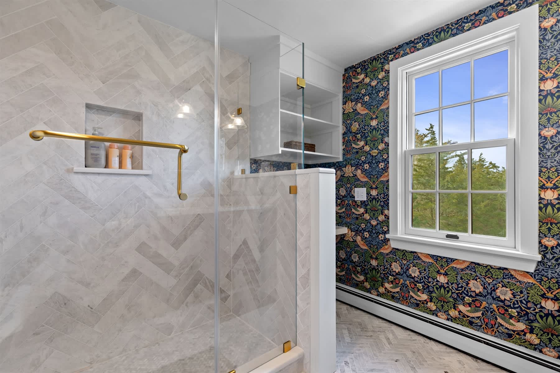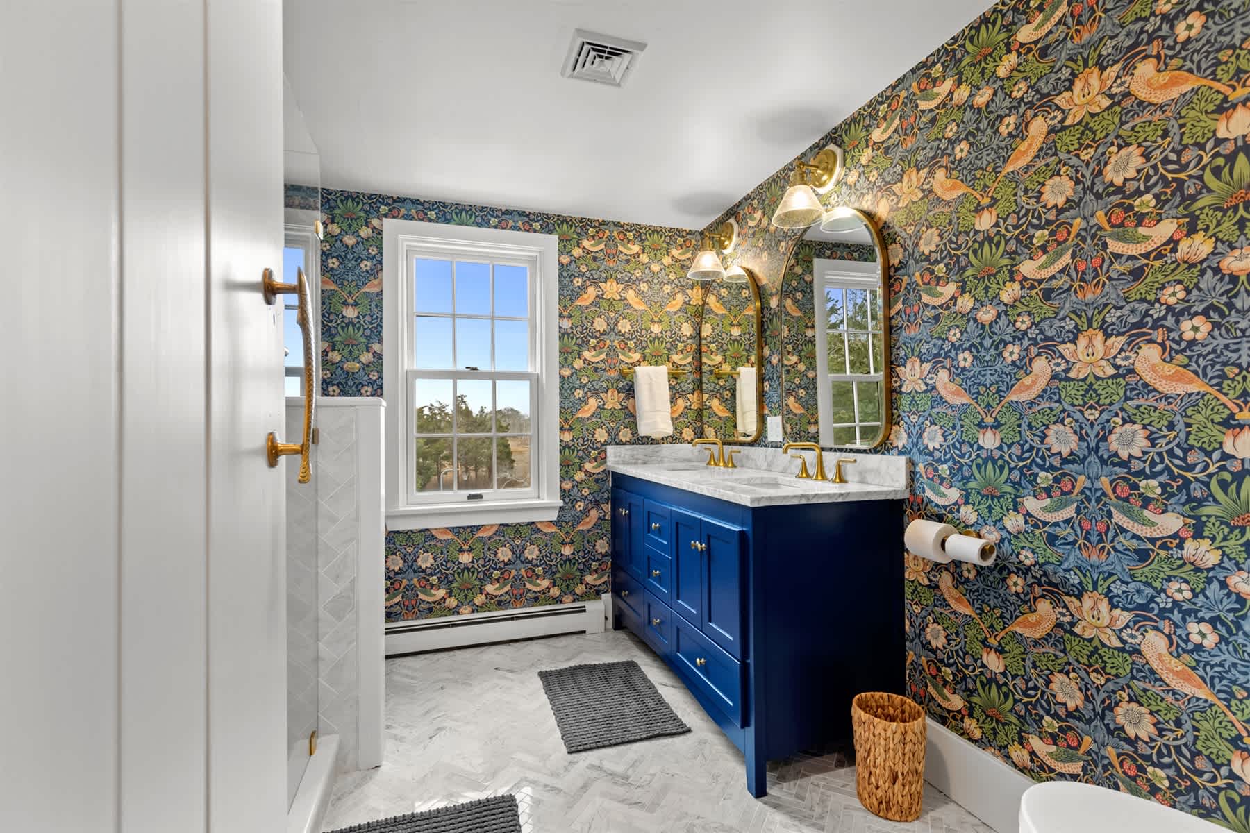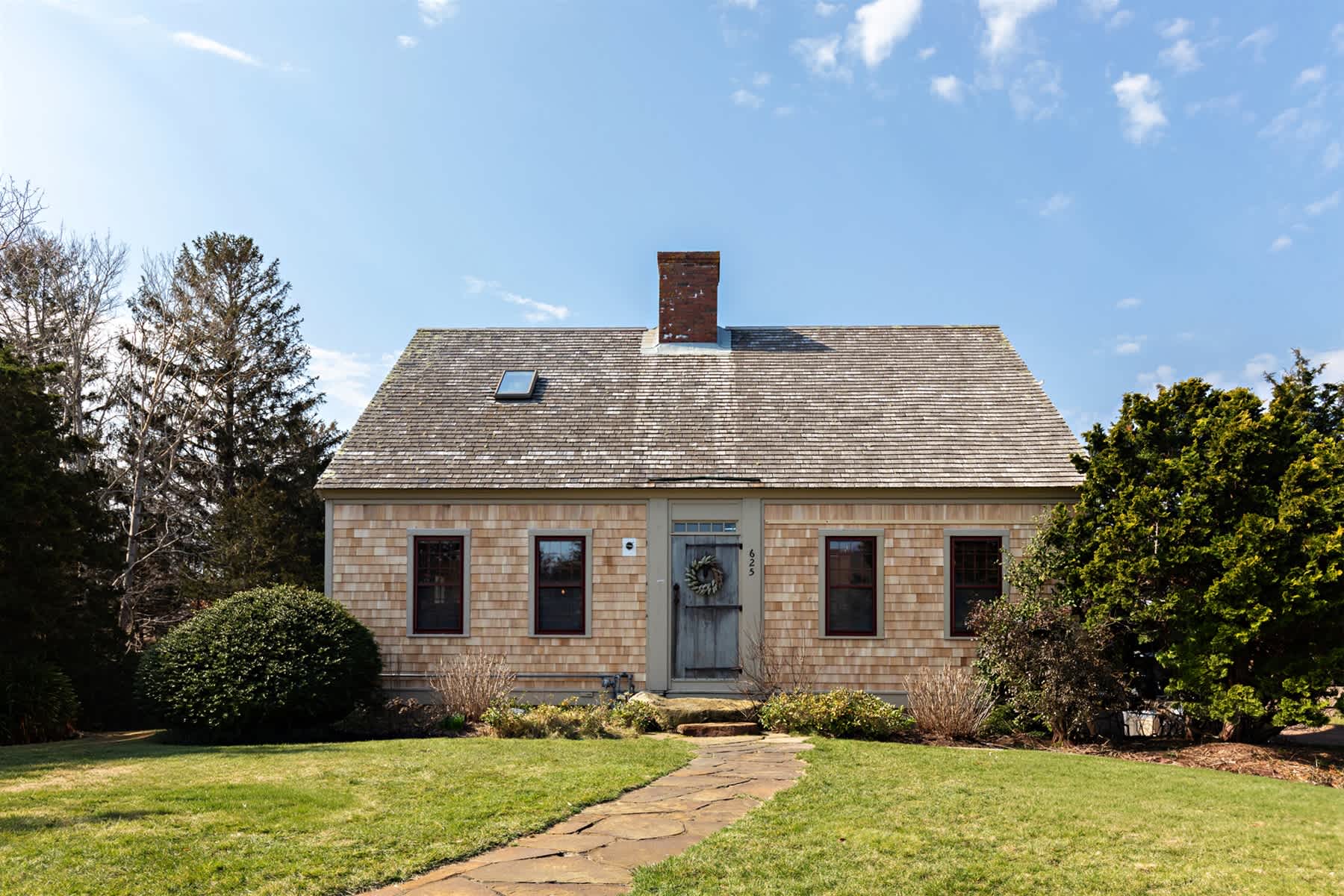 Inside, the main house blends classic Cape charm with fresh, high-end updates. The kitchen features stainless steel appliances, crisp cabinetry, warm wood counters, and a dedicated coffee station, creating an easy gathering space. The library adds a dramatic, comfortable retreat with deep green walls, leather seating, built-ins, and a TV, while two queen bedrooms and a king room upstairs offer soft light, built-in storage, and a calm coastal feel. The two full bathrooms - one on each floor - are especially striking, with boutique-style finishes, marble surfaces, and brass accents. For groups that need to spread out, there is a charming guest house to enjoy as well, which will be ready by Memorial Day weekend 2026. The guest house features one king bedroom upstairs with a full ensuite bathroom, and a charming common space on the lower level. Outside, the spacious yard offers room to spread out, relax, and play, with open lawn space and a firepit to make the most of summer days and nights.