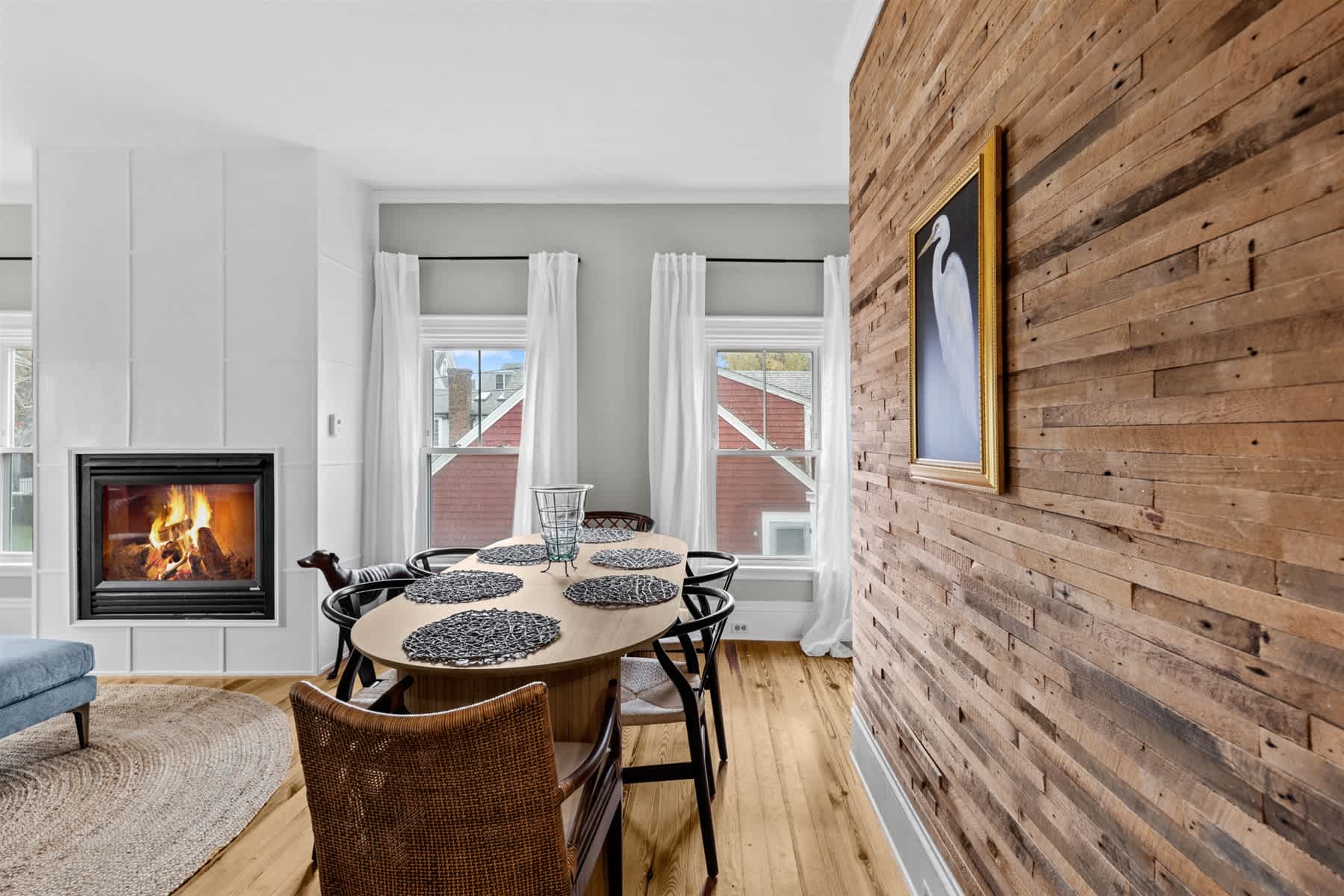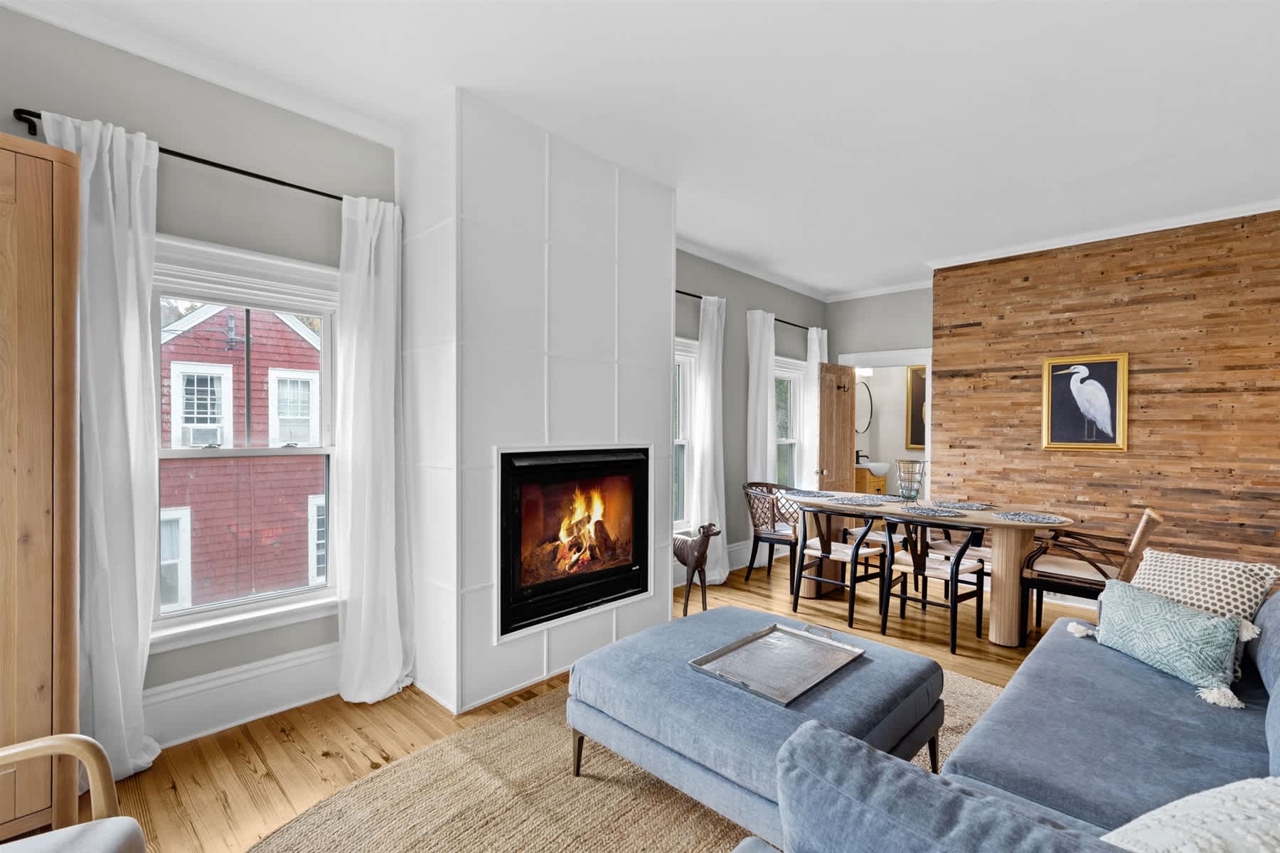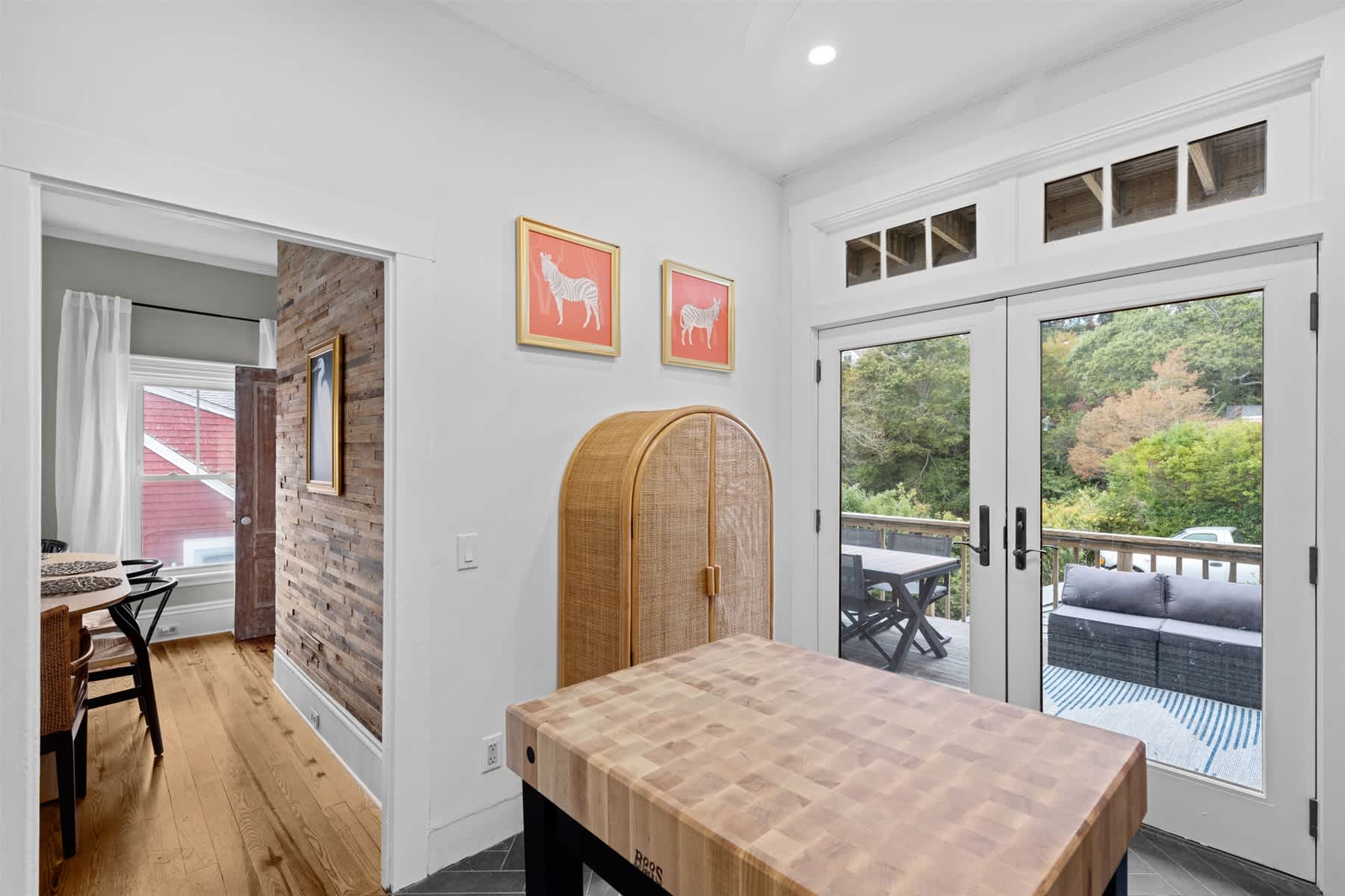 Stepping inside, you’ll discover an open-concept living and dining area anchored by a gorgeous gas fireplace. This spacious room invites conversation and connection, with plush, sunlit seating that’s perfect for relaxing with your group. The modern dining table offers ample space for shared meals, while the bright white kitchen, softened by warm wood accents and a large butcher block center island, is a dream for the home chef. Equipped with plenty of counter space, cooking amenities, and brand-new stainless steel appliances, it makes entertaining effortless. When you’re ready for fresh air or some sun, simply open the French doors to the back deck and unwind in style. It is also worth noting that this Provincetown vacation rental comes with two parking spots, making it all the more desireable for those looking to branch out and explore the Outer Cape by car.