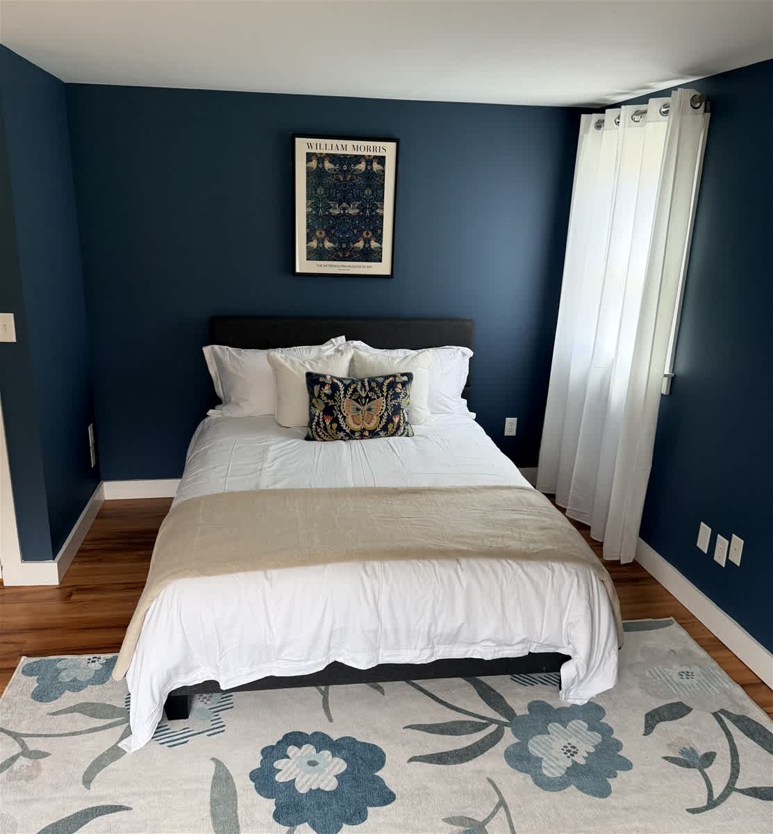 All four bedrooms are located on the second floor. One bedroom has two twin beds, the primary bedroom has a queen bed, and two additional bedrooms each offer a full bed. There are two full bathrooms, including a first-floor bath with a shower and a second-floor bath with double sinks, a bathtub, and a separate shower.