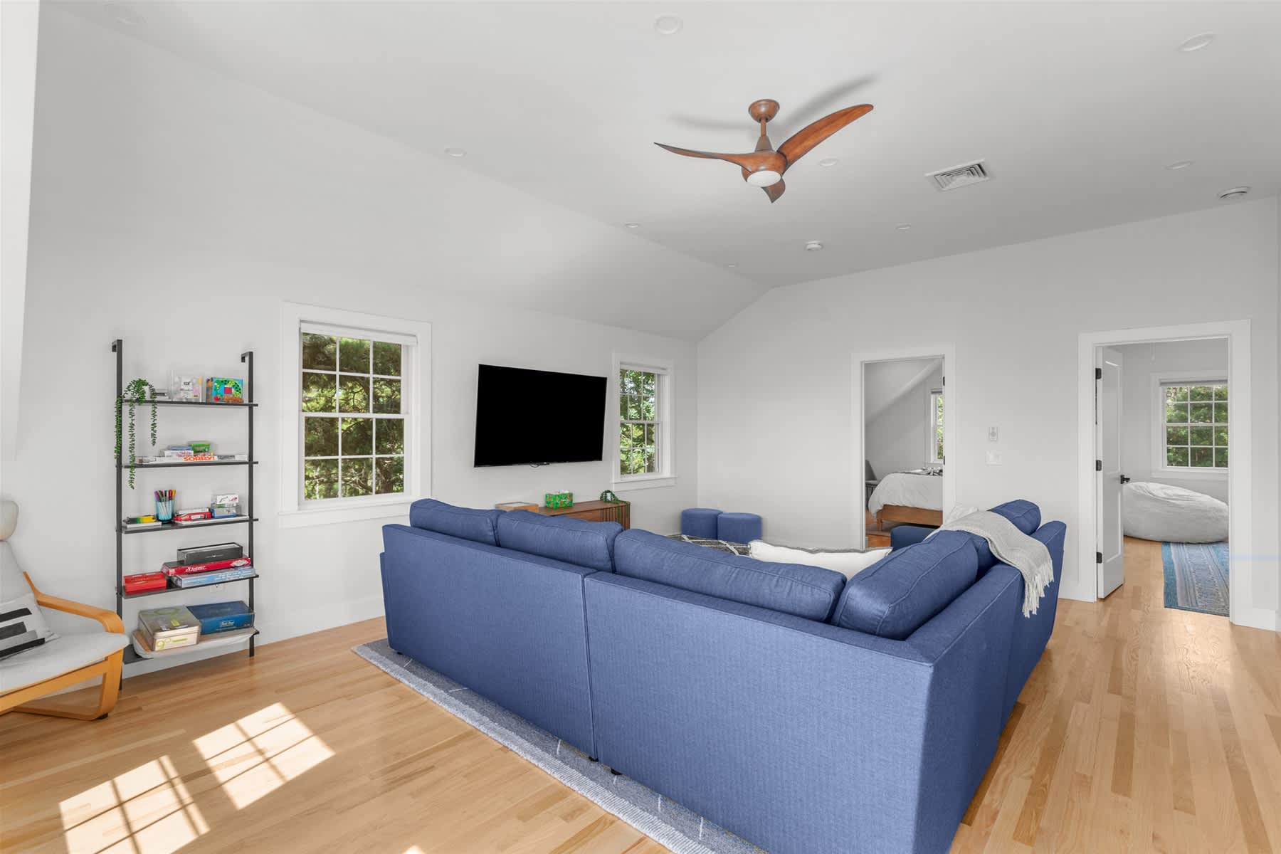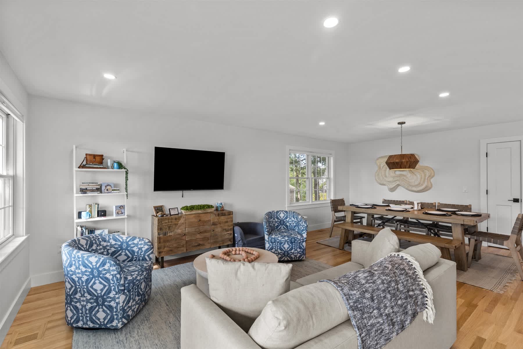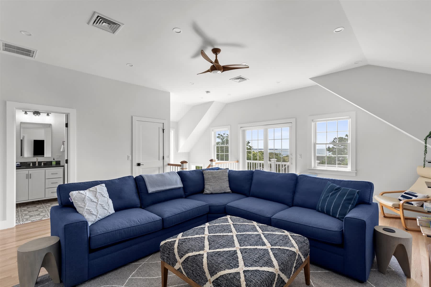 Step inside to a jaw-dropping open-concept kitchen, dining, and living area awash with natural light. The bright white kitchen, outfitted with stainless steel appliances and a generous island with bar seating, is perfect for preparing gourmet meals or gathering friends and family. Adjacent, a striking farmhouse dining table invites everyone to linger over memorable dinners. The living room offers plush seating and a smart TV, while two balconies frame shimmering water views and feature an outdoor dining table, a Weber grill, and inviting wicker egg chairs—a fantastic spot for savoring sunsets or enjoying a morning coffee. Upstairs, a spacious family room with a sectional couch provides additional living space, and the three elegantly appointed bedrooms include a king bed, a queen bed, and a playful double bunk room for the kids.